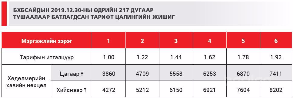 Гурав. Барилга, хот байгуулалтын сайдын 2019 оны 217 дугаар тушаалын 1 дүгээр хавсралтаар Барилгын ажилтны тариф цалингийн жишиг, 2 дугаар хавсралтаар цаашид тарифт цалинг индексжүүлэн хэрэглэх аргачлалыг баталсан. Барилгын тухай хуулийн 33 дугаар зүйлийн 33.1.10 дугаарт барилгын ажилтны тарифт цалингийн жишгийг Санхүүгийн асуудал эрхэлсэн төрийн захиргааны төв байгууллагатай зөвшилцөж батлах заалттай байдаг. Хуулийн энэ заалтын дагуу шинэчилсэн тарифт цалингийн жишгийг Сангийн яамтай зөвшилцсөн. Мөн Захиргааны ерөнхий хуулийн дагуу Захиргааны хэм хэмжээний актын улсын нэгдсэн санд 2020 оны 1 дүгээр сарын 10-ны өдөр 4625 дугаарт бүртгүүлсэн.