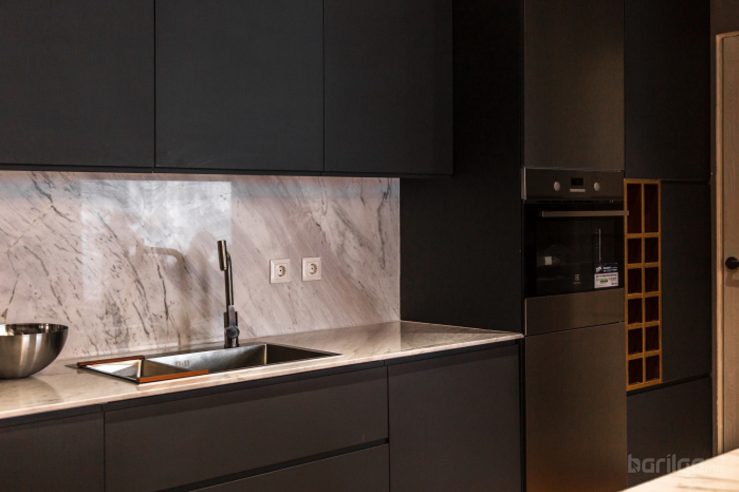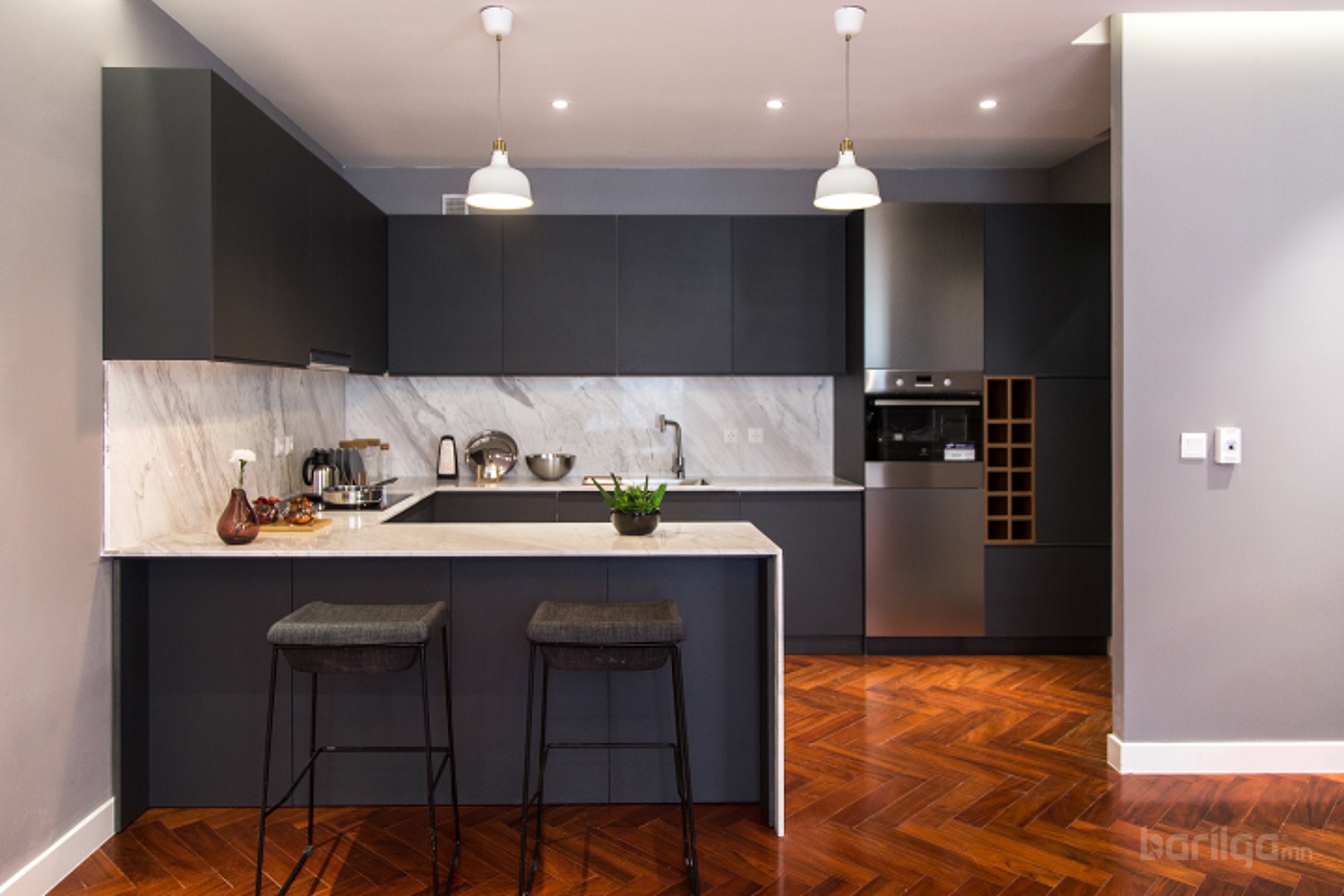 Гал тогооны өрөөг эзэгтэйд зориулан эмх цэгцтэй байлгах зорилгоор том шүүгээнүүд болон агуулах өрөөтэй шийдсэн. Зочны өрөөний хэсэгтэй уялдуулан хар саарал өнгийг цагаан гантиг чулуутай хослуулсан. Мөн дарсны тавиурын хэсэгт цэвэр модны оруулга оруулж өгснөөр илүү эко, зөөлөн дулаан мэдрэмжийг төрүүлэх юм.