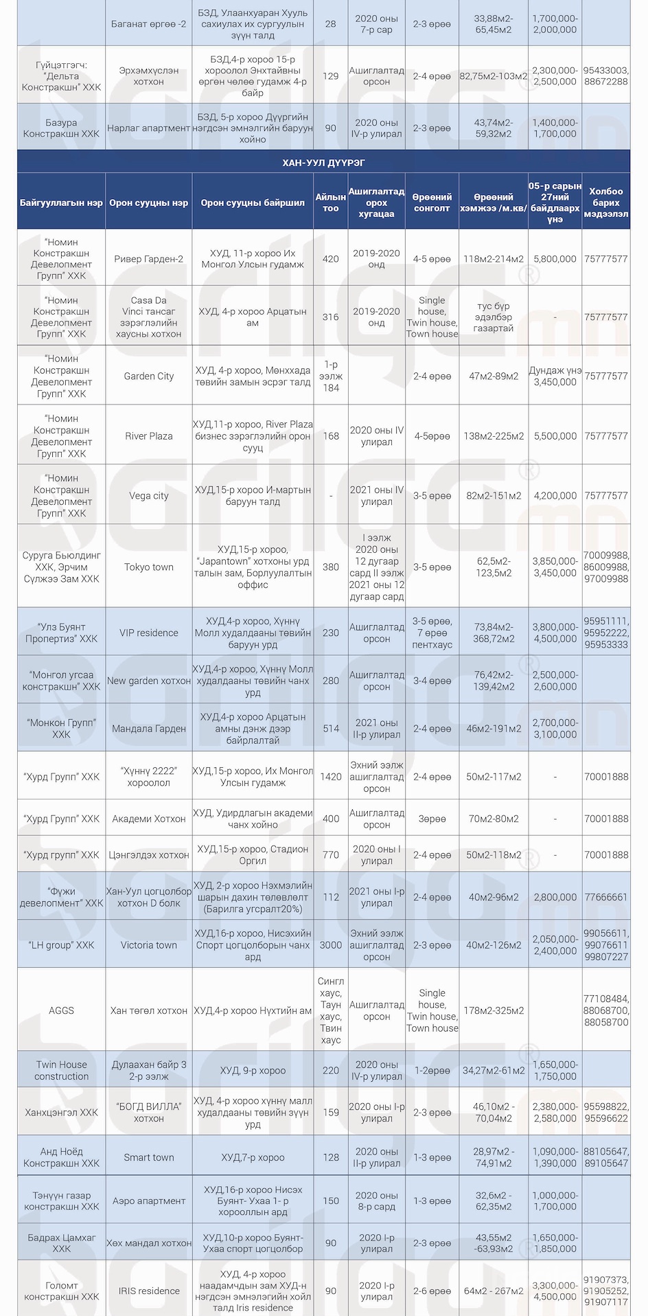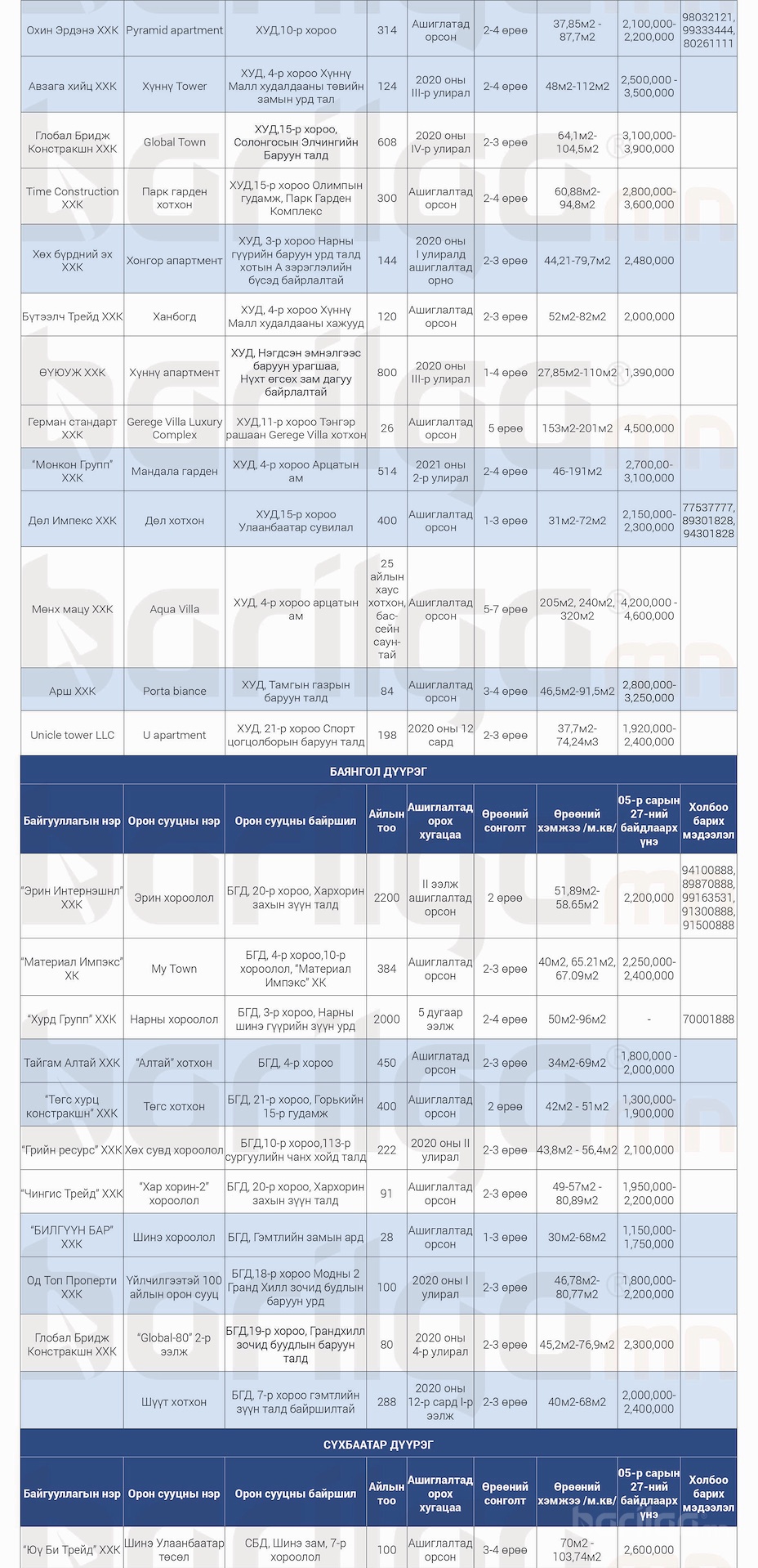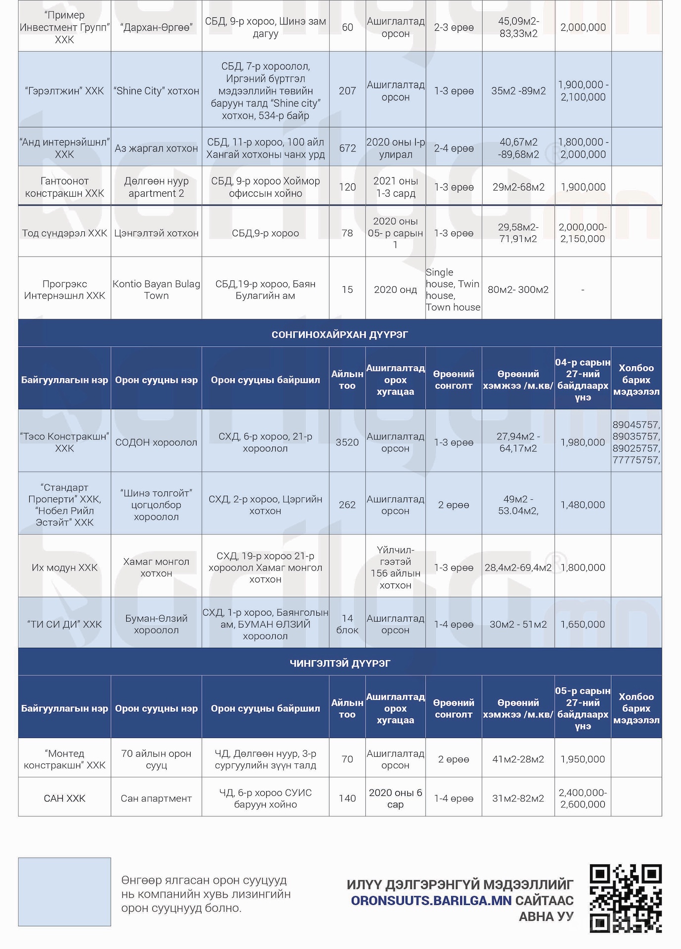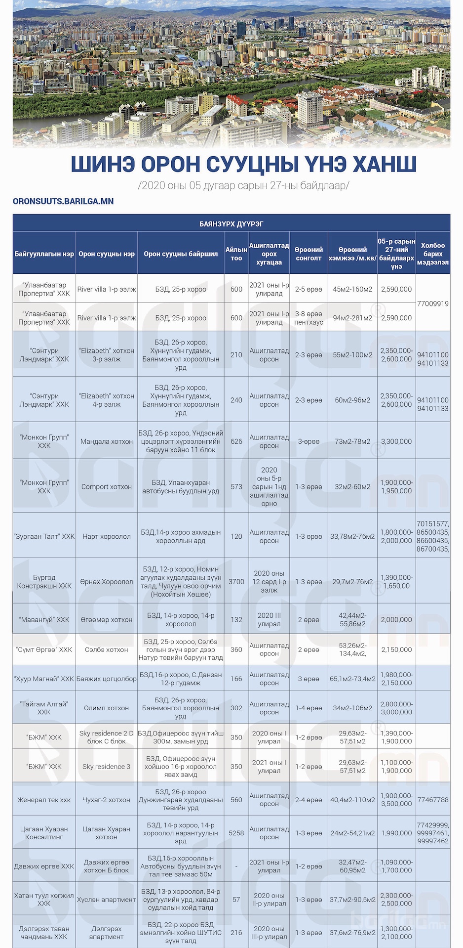 "Барилга.МН" сэтгүүлээс сар бүр хүргэдэг ШИНЭ ОРОН СУУЦНЫ үнэ ханшийн мэдээллийг танд хүргэж байна. Илүү дэлгэрэнгүй мэдээлэл авахыг хүсвэл манай сэтгүүлийн 2020 оны 6 сарын дугаар №120-оос үзэх боломжтой.