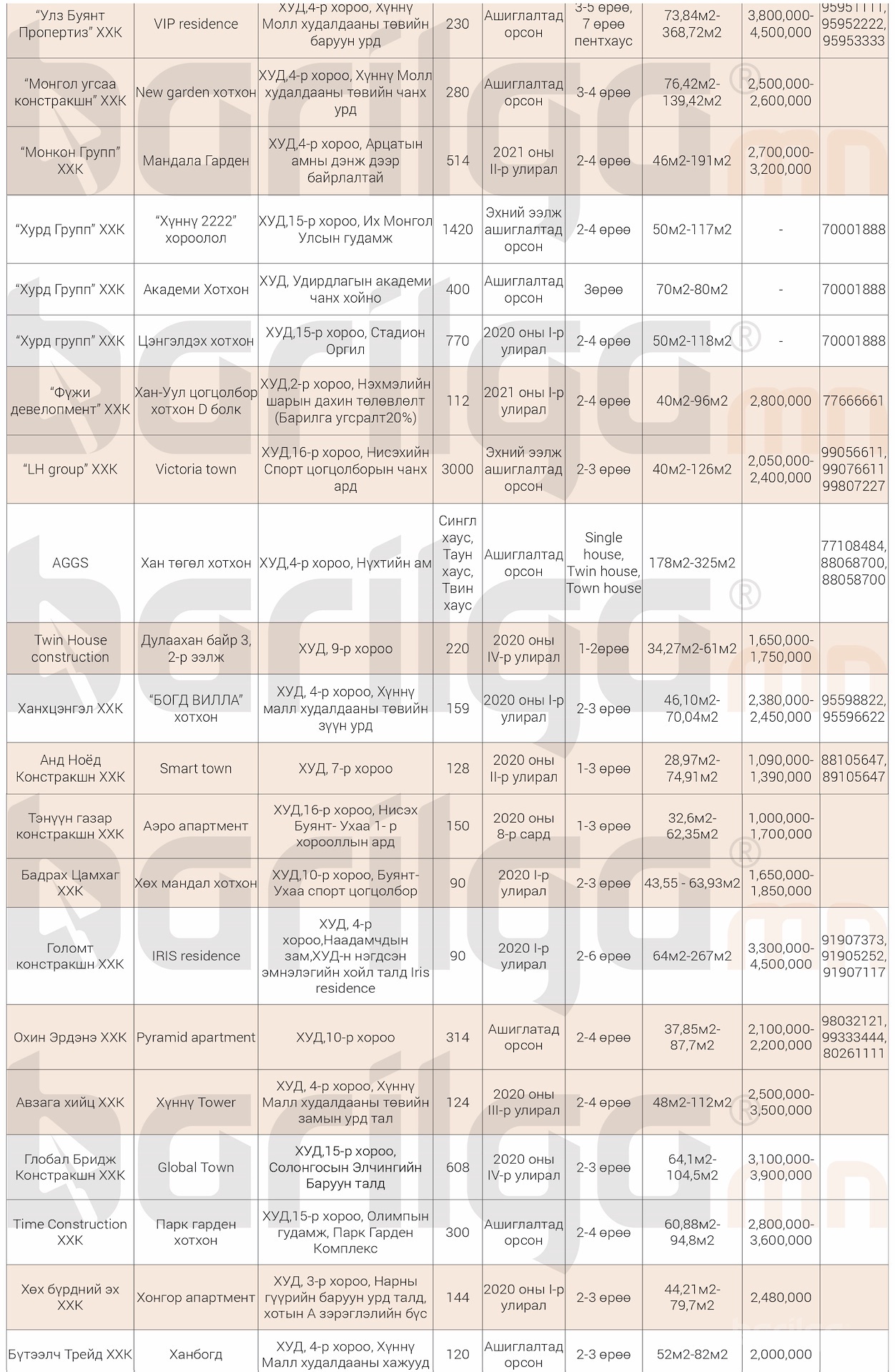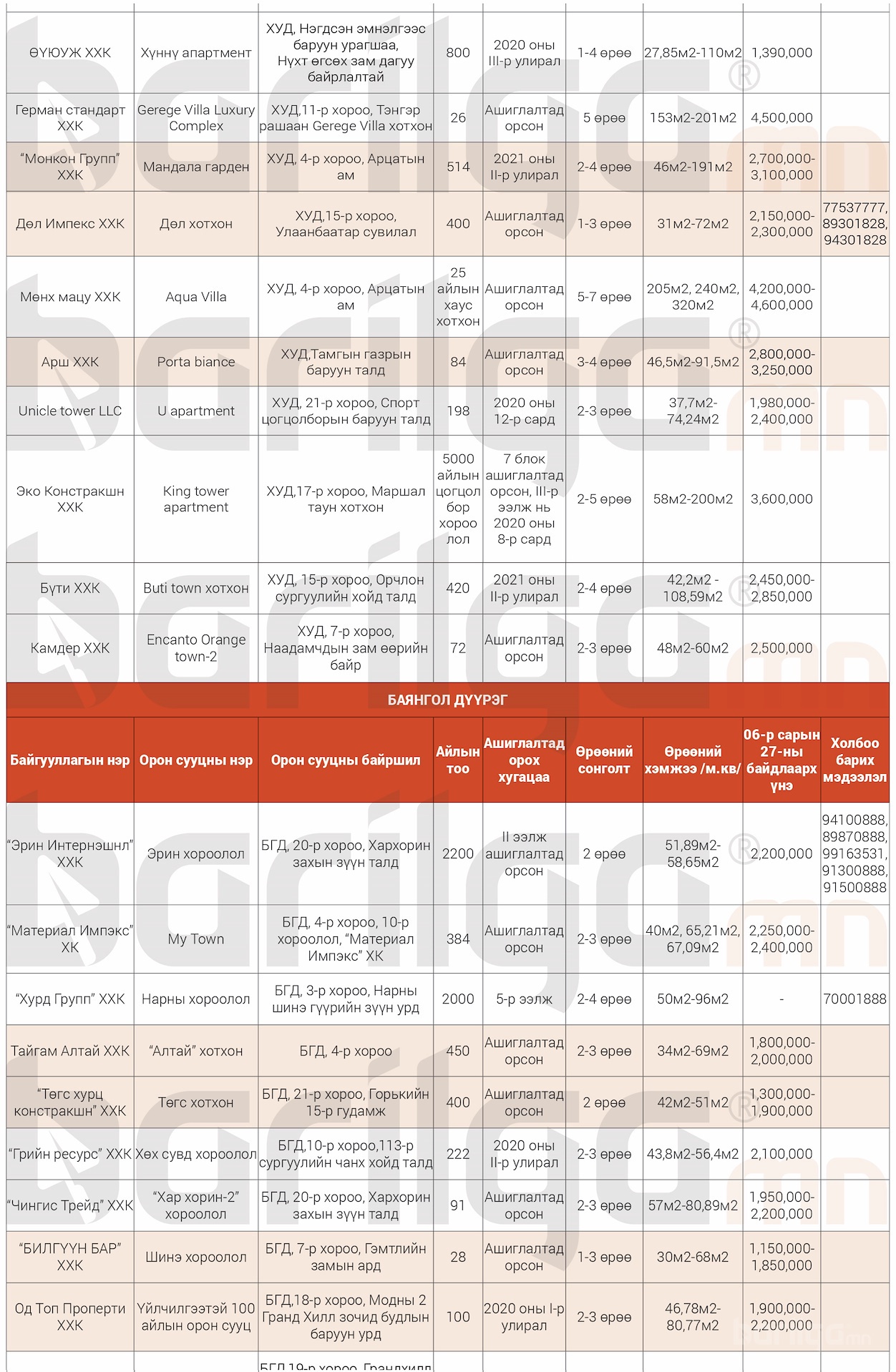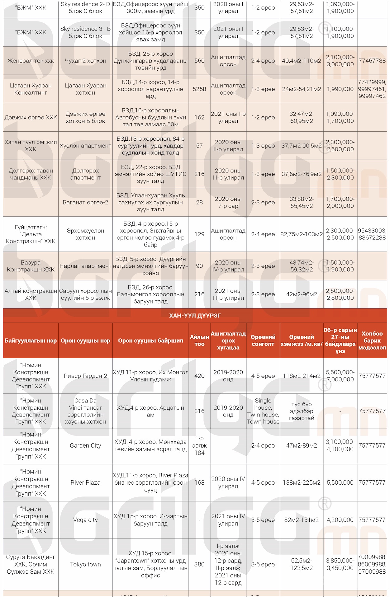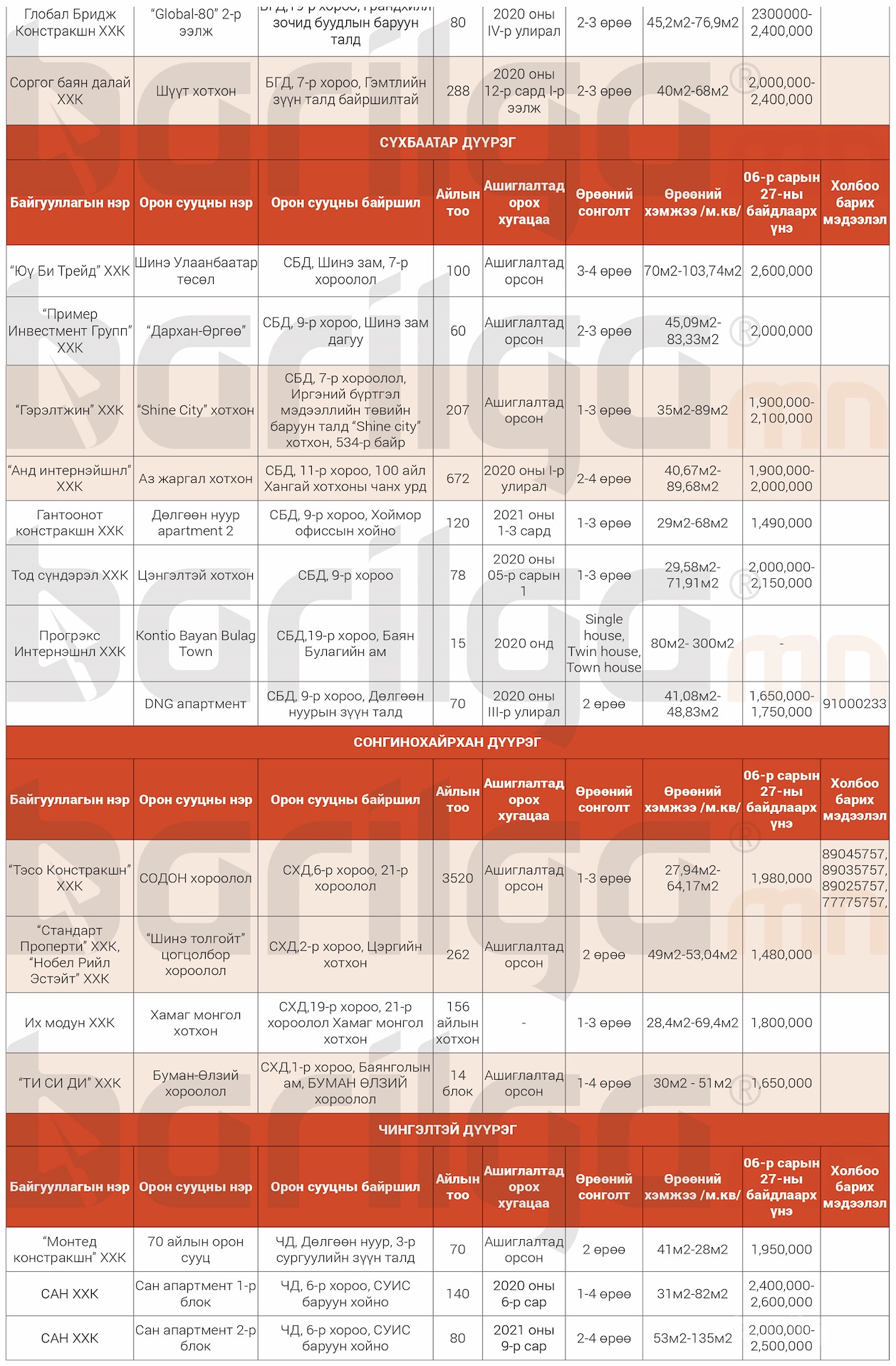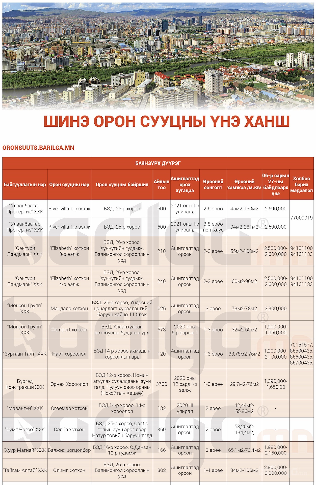 "Барилга.МН" сэтгүүлээс сар бүр хүргэдэг ШИНЭ ОРОН СУУЦНЫ үнэ ханшийн мэдээллийг танд хүргэж байна. Илүү дэлгэрэнгүй мэдээлэл авахыг хүсвэл манай сэтгүүлийн 2020 оны 7 сарын дугаар №122-оос үзэх боломжтой.