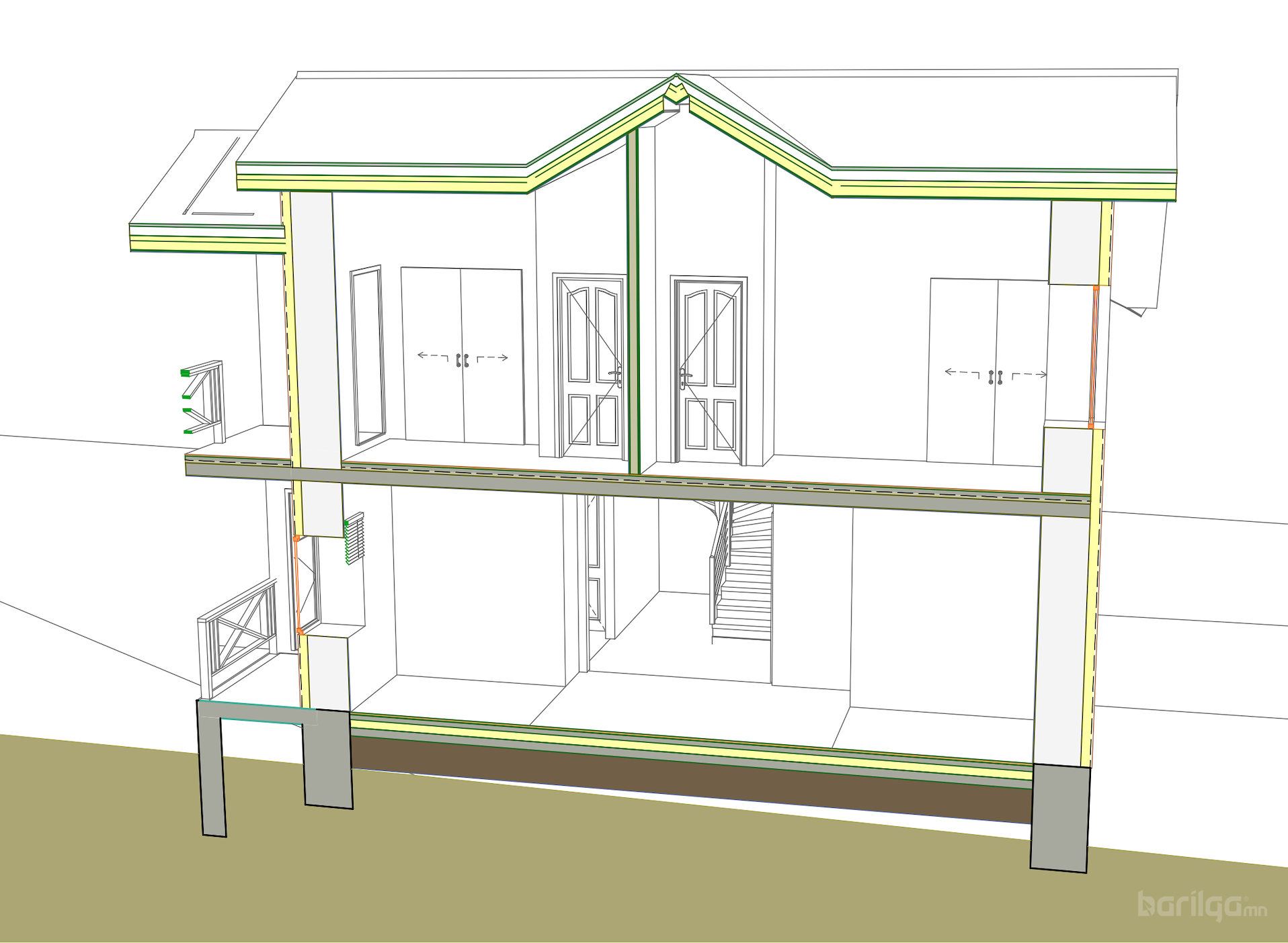 А сууц- Нийтлэг баригддаг сууц-10 см полистирол дулаалгатай, МАК блокон ханатай, 10см шилэн хөвөн дулаалгатай модон шувуун нуруун дээвэртэй