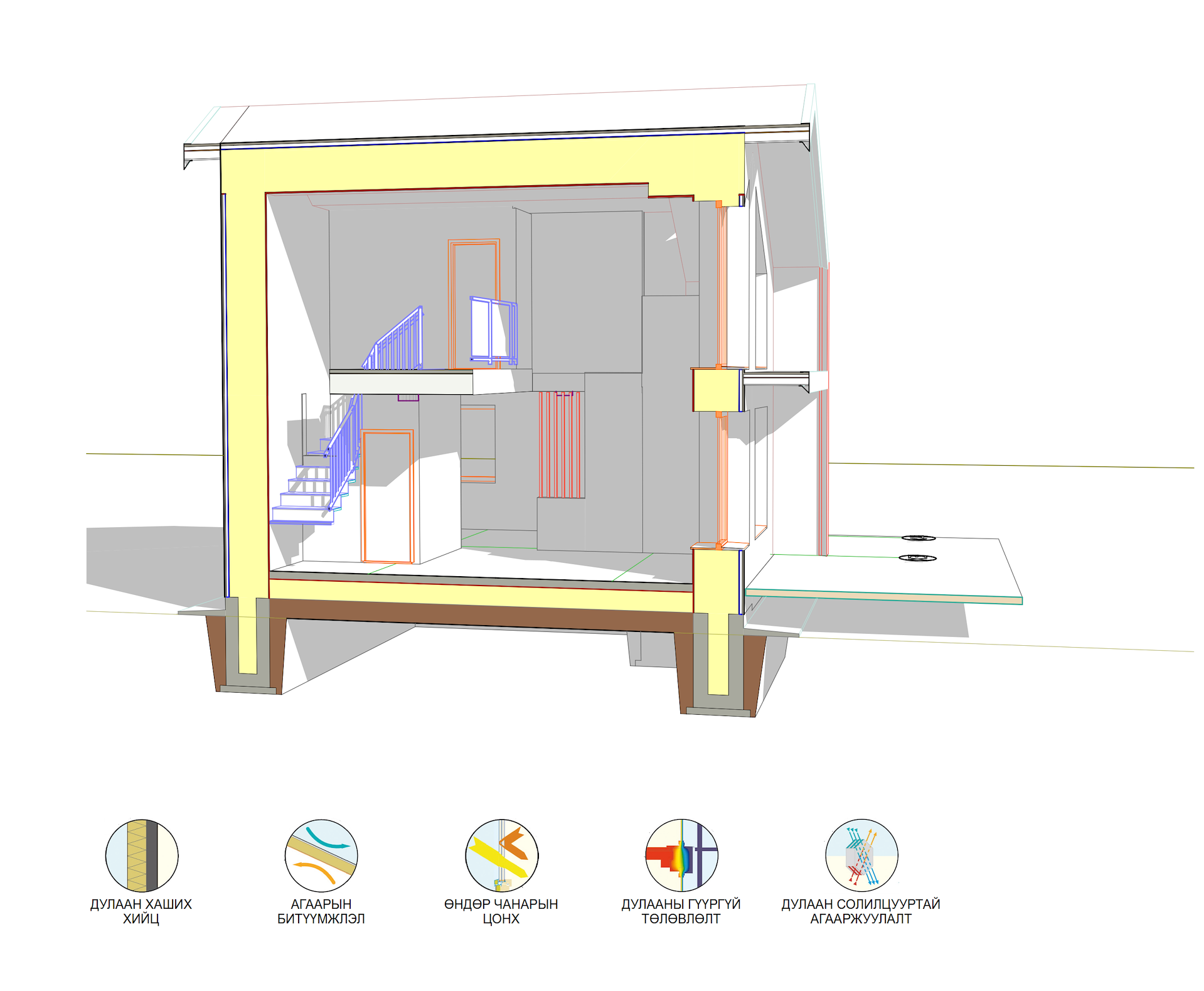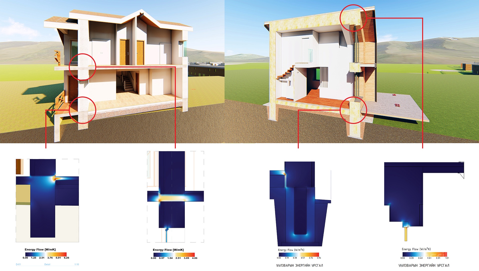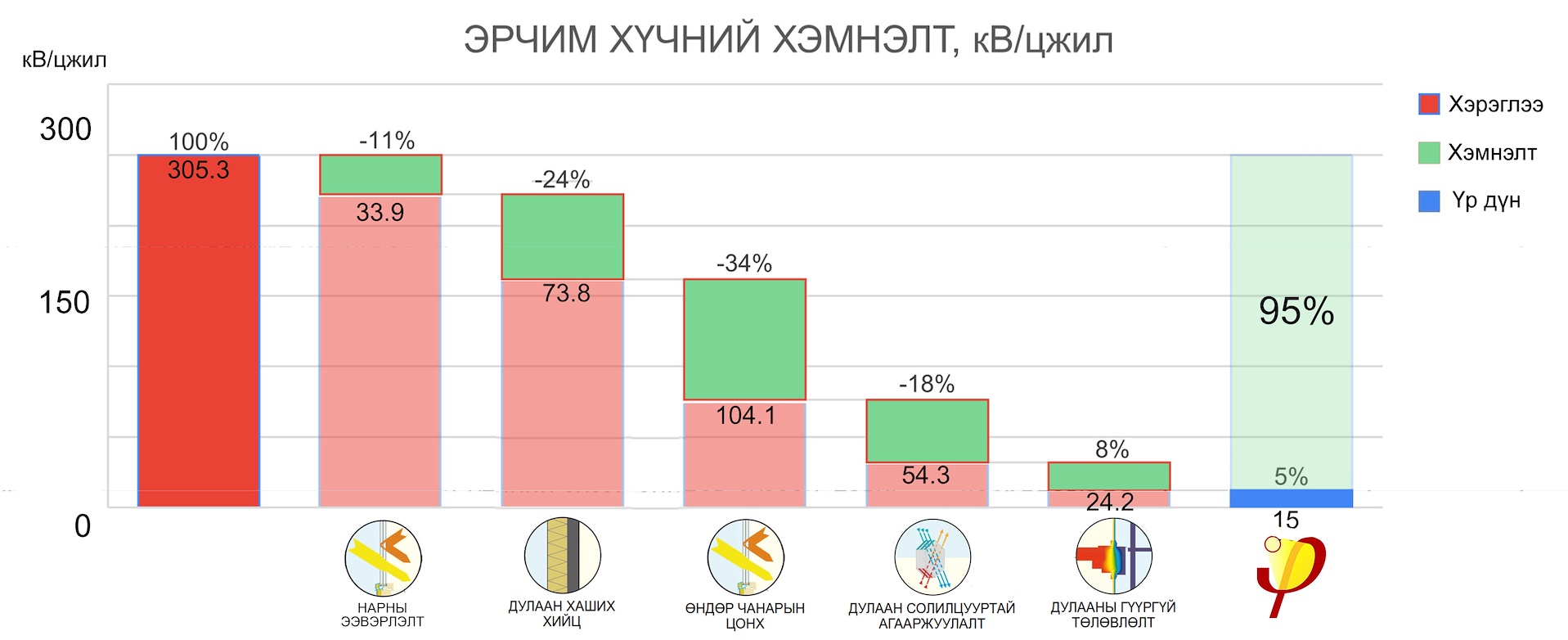 Тэгэхээр энэ үр дүнд хэрхэнхүрэх аргачлал технологийн талаар тайлбарлая. Манайх шиг цаг уурын хүйтэн бүсэд хамаарагддаг нутагт баригдаж буй барилгын эрчим хүчний нийт хэрэглээний 80-85%-г халаалтын зардал эзэлдэг тулдулааны эрчим хүчийг хэмнэх нь барилгын эрчим хүчний хэрэглээг том дүнгээр багасгах гол шийдэл юм.