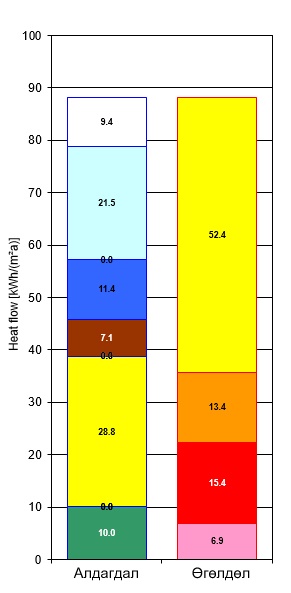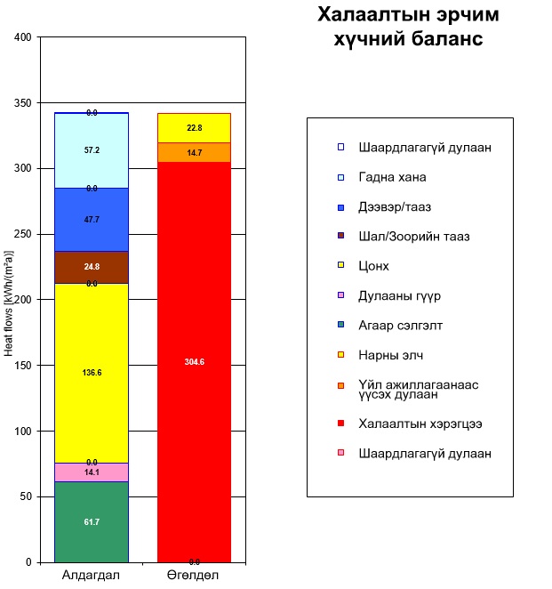 А ба Б сууцанд хийсэн Халаалтын эрчим хүчний балансыг шинжилж үзэхэд А барилгын алдагдал өндөр байгаа учир халаалтын ачаалал өндөр буюу 304.6 кВц/ж гарсан байна. Харин Б сууцны хувьдалдагдаж буй дулаан маш бага байгаа бөгөөд нөхөж өгөх дулааны 60 орчим хувийг нарнаас авч байна. Б сууцанд 60 ваттын ламп 5-г асаагаад дулаахан өвөлжиж болохуйц маш бага халаалтын ачаалалтай байна.