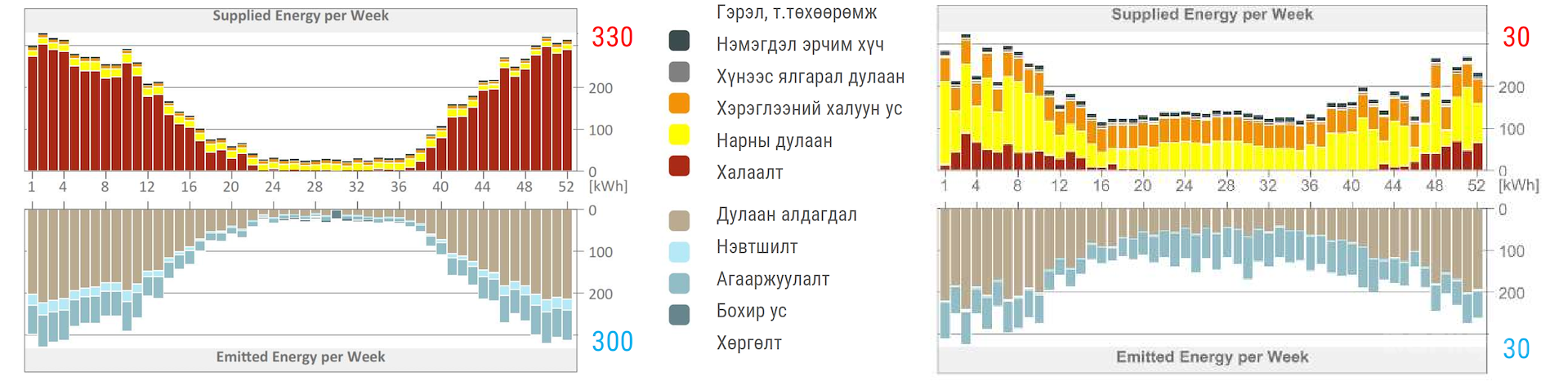 Дээрх хоёр амины сууцны хэрэглэх эрчим хүчний хэрэглээг 1жил буюу 52 долоо хоногийн хугацаанд тооцож үзэхэд нийт А сууцны хувьд 305,3кВц/м2жил харин Б сууцны хувьд 20 дахин багабуюу 15кВц/м2жил гэсэн үр дүн гарлаа. Энэ нь А барилгын сарын зардал 600,000төг гардаг бол Б барилгын хувьд 30,000 төг гэж ойлгож болох юм.
