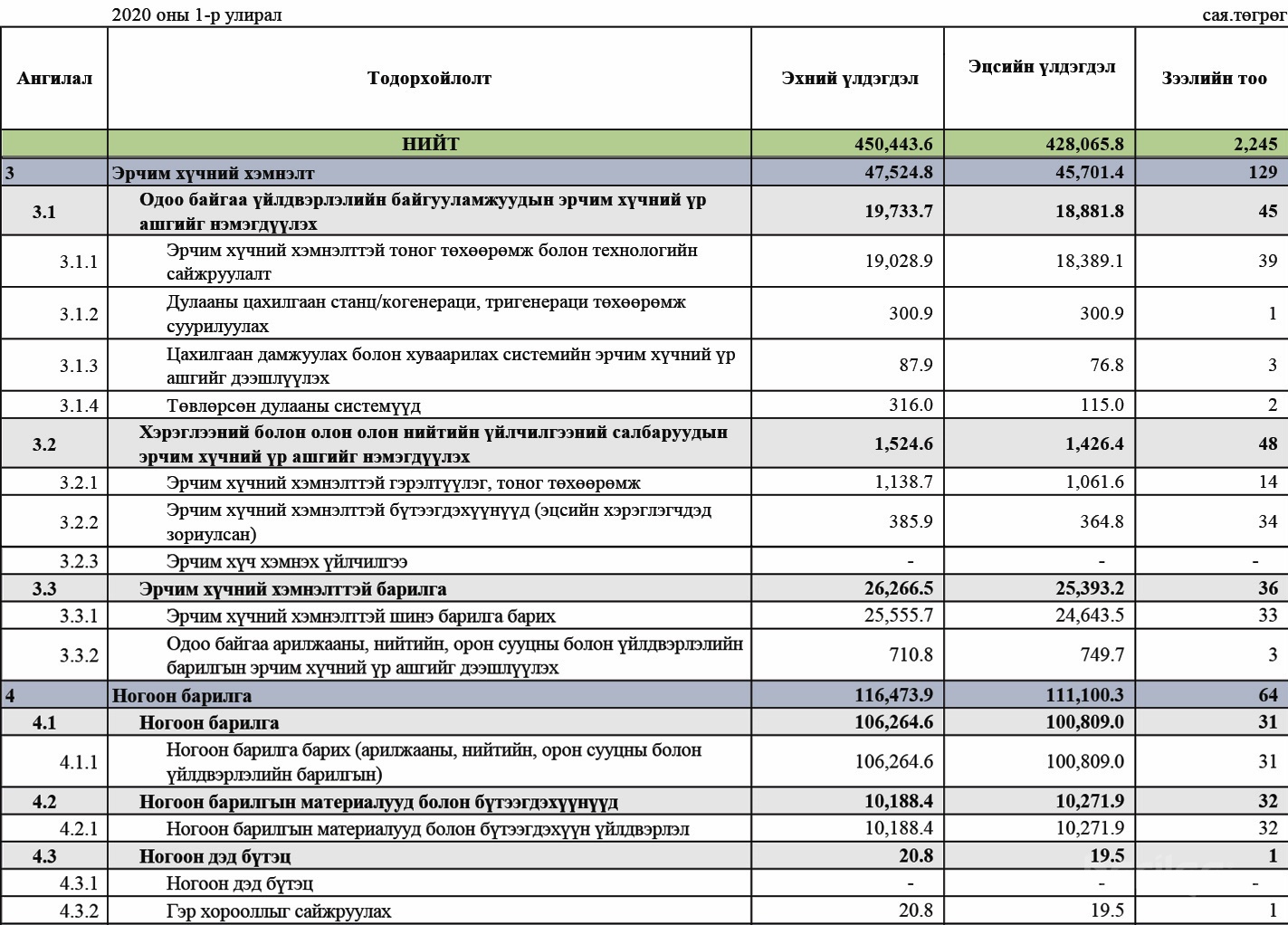 Монгол банкны мэдээлснээр ногоон барилгад 400 сая төгрөгийг 64, эрчим хүчний хэмнэлттэй барилгад 140 сая төгрөгийг 36, ногоон барилгын материал болон бүтээгдэхүүнд 400 сая төгрөгийг 32 байгууллага болон иргэнд олгосон байна.
