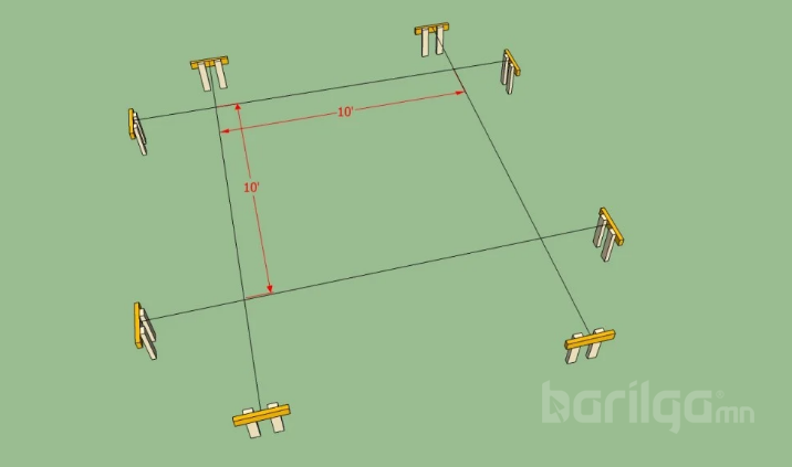 Хамгийн эхэнд та зуслангийн газартаа модон сүүдрэвчээ барих зохимжтой газраа сонгож, тэгшилж бэлдсэн байх шаардлагатай. Метр, тэгшусаа ашиглан сүүдрэвчийнхээ хэмжээг газарт буулгаж бэхэлгээтэй утас татах хэрэгтэй. 4 булангийн тэгш эсэхийг гурвалжинг ашиглан сайтар шалгаарай. (10’=3,05м)
