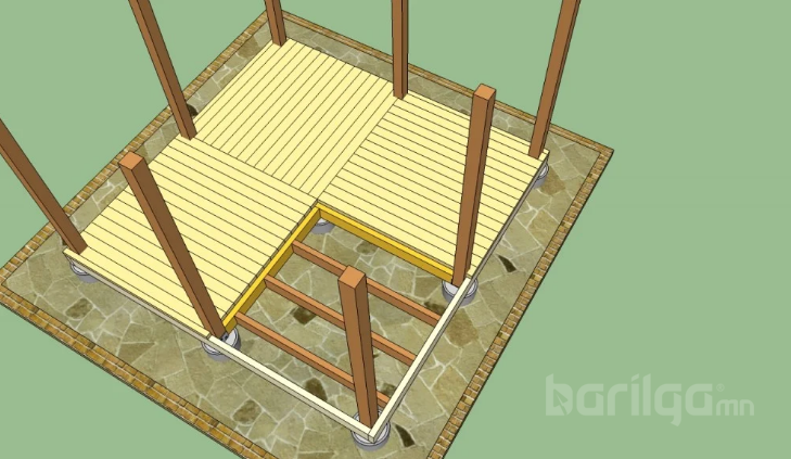 Захын багануудын доогуур эргэн тойрон хүрээ банз хадна. Модон шалыг хийхдээ эхлээд зураг дээр харуулсантай адилаар суурийн даацын “+” хэлбэрийн голлох 2 банзыг суулгана.Хүрээ банзуудыг 6 см урттай боолт хадаас ашиглан бэхлээрэй.