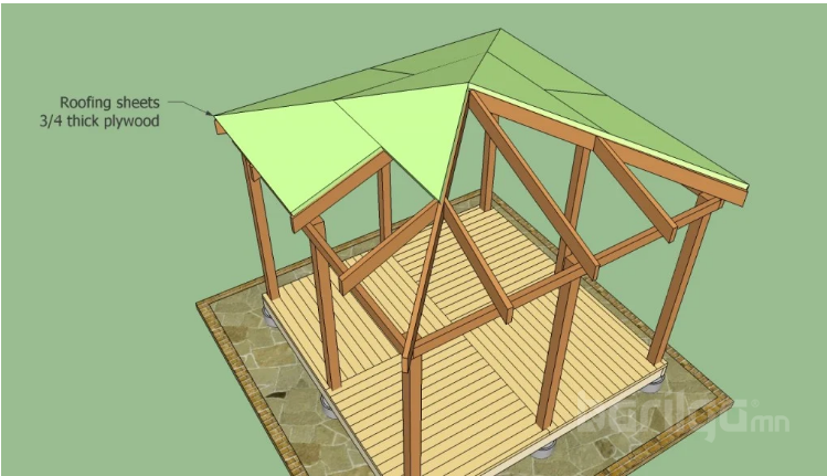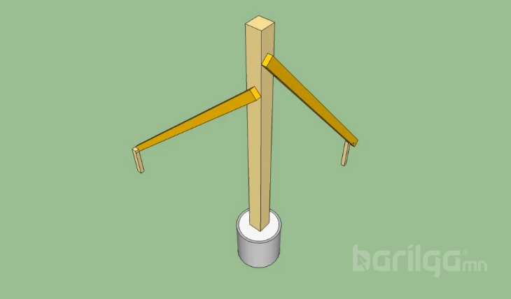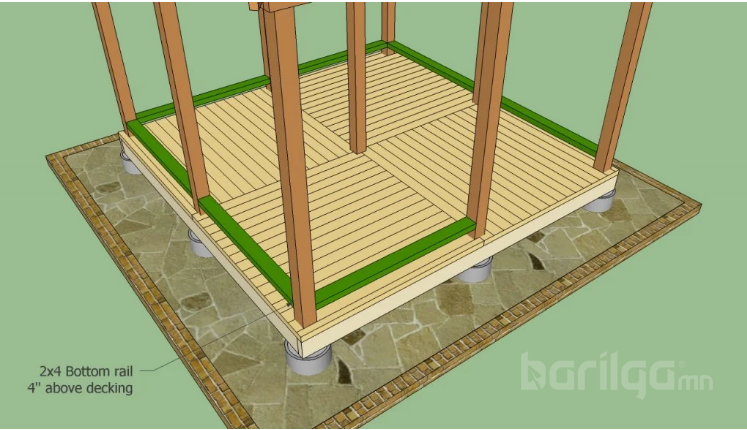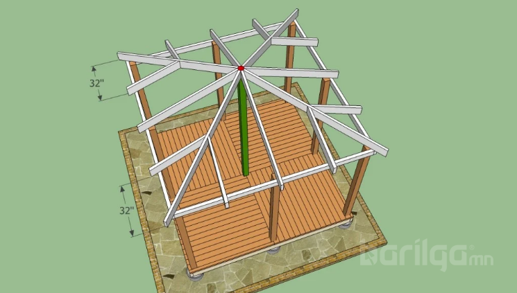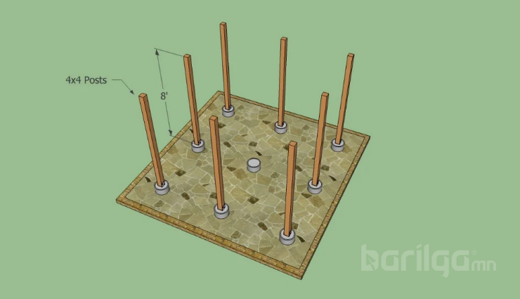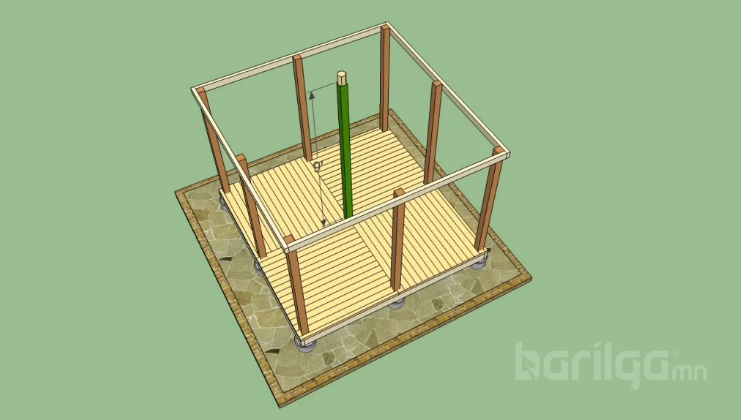 Дараа нь 2х4 см хэмжээтэй 4 банзаар дээд хүрээг бэхлэнэ. Та 9’=2.7м урттай 8х8 модон брус сүүдрэвчийн голд байрлуулж багана босгоно.