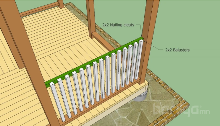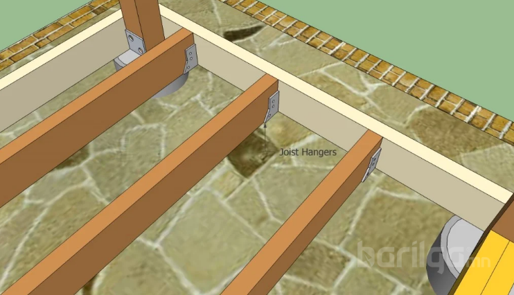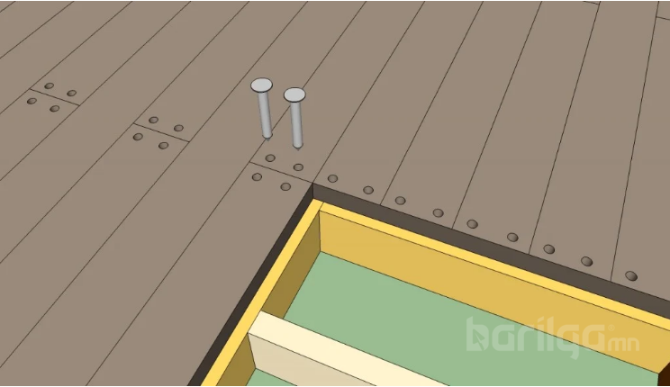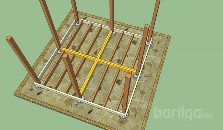 Үүний дараа та 2×6см модон банзаар шалны дай модыг металл булан ашиглан байрлуулна. Банзнууд нэг түвшинд байгаа эсэхийг сайн харж хүрээтэй тэнцүүлэн бэхлээрэй. (120’’=3.05м)