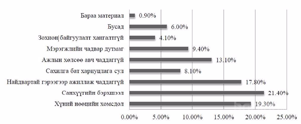 Санхүүгийн бэрхшээл, хүний нөөцийн хомсдол 2 хамгийн их хувь эзэлж байна. Үүнийг даван туулахад тухайн салбар луу чиглэсэн бодлого, хөшүүрэг нэн чухал юм. Хамгийн гол нь тогтвортой, урт хугацааны хүнийн нөөцийг тогтвортой хөгжүүлэх бодлого, систем чухал юм. Харин найдвартай гэрээгээр ажиллаж чадахгүй байгаа хэмээн 18 орчим хувь нь илэрхийлжээ. Үүнийг сайжруулах арга зам нь ажилчдыг эрх зүйн мэдлэг, чадвартай болгох, аливаа ажлаа мэргэжлийн түвшинд бизнесийн зарчмаар хийж, гүйцэтгэж, гүйцэтгүүлж сургах явдал юм.