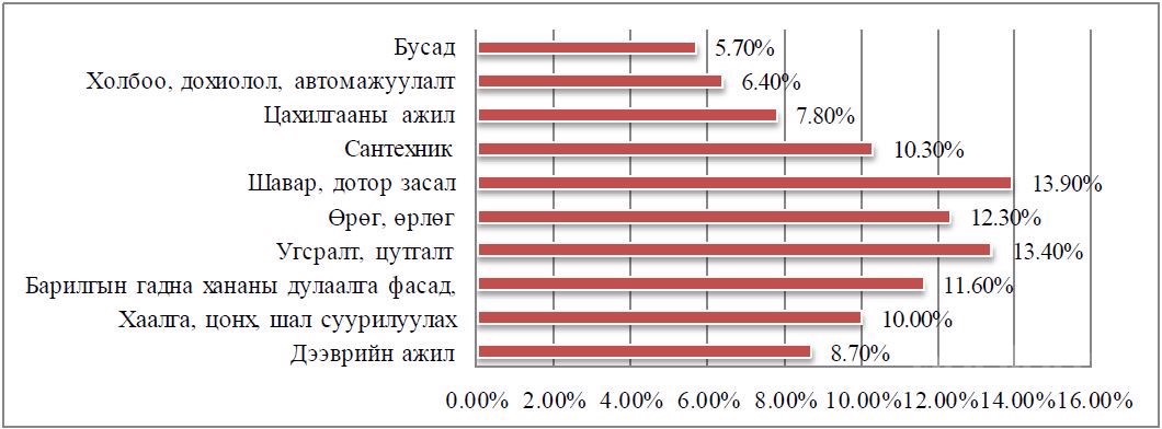 Бригадуудын үйл ажиллагаа явуулж буй чиглэлийг дээврийн, хаалга цонх, шал суурилуулах, барилгын гадна ханын дулаалга, фасад, угсралт, цутгалт, өрөг, өрлөг, шавар, дотор засал, сантехник, цахилгааны ажил, холбоо дохиолол автоматжуулалтын болон бусад гэсэн 10 төрлийнүйл ажиллагаагаар авч үзсэн. Судалгаанд хамрагдсан бригадуудын (үйл ажиллагааны давхардсан тоогоор) 107 нь буюу 13.9 % нь шавар, дотор засал, 103 (13.4 %) нь угсралт цутгалт, 95 (12.3 %) нь өрөг өрлөг, 89 (11.6 %) нь барилгын гадна ханын дулаалга, фасад, 79 (10.3 %) нь сантехник, 67 (8.7 %) нь дээврийн ажил, 60(7.8%) нь цахилгааны ажил, 49 (6.4%) нь холбоо дохиолол, автоматжуулалт зэрэг ажлуудыг хийж гүйцэтгэдэг байна.