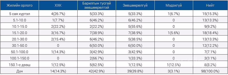 Бригадын 70 хувь нь жилийн 30 сая хүртэл төгрөгийн орлоготой ажилладаг байна. Бригадын жилийн орлогын талаар нийт бригадын 15 (14.9%) нь 5 сая хүртэл төгрөг, 14 (13.9%) 5.1 – 10 сая төгрөг, 10 (9.9%) нь 10.1 – 15 сая төгрөг, 19 (18.8%) нь 15.1 – 20 сая төгрөг, 13 (12.9%) нь 20.1 – 30 сая төгрөг, 12 (11.9%) нь 30.1- 50 сая, 7 (6.9%) нь 50.1- 100 сая төгрөг, 11 (10.9%) нь 100.1 саяас дээш төгрөгийн жилийн орлоготой байдаг гэж хариулсан байна. Энэ нь үйл ажиллагааны чиглэл болон хийж буй төслүүдээс хамааралтай байгаа нь ажиглагдаж байна.