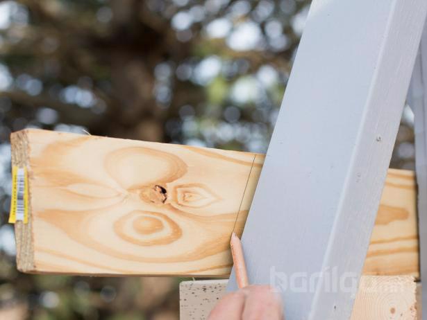 1х4 хэмжээтэй модон банзыг “А” хэлбэрийн рамд тэнцүүлэн барьж, харандаа ашиглан банзны ар талд өнцгийг тэмдэглэнэ.