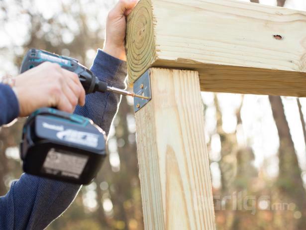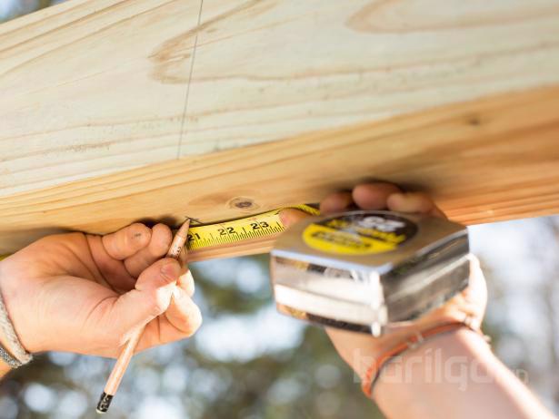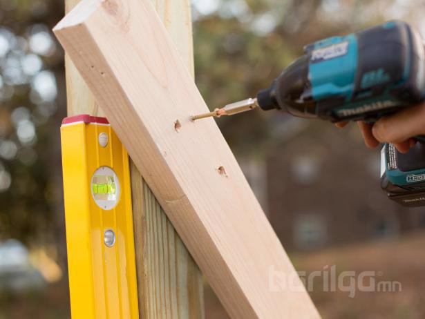 Рамны тэгшийг хангах зорилгоор 2х4 хэмжээтэй палкаар рамаа түр бэхлээд төгсгөл хэсгийг газарт байрлуулна. Ингэхдээ дээд хэсгийн 4x4x10 хэмжээтэй модон палкыг ч мөн тэгш байлгахаа мартаж болохгүй.