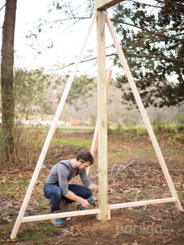 Зурагт харуулсантай адилаар 2х4 хэмжээтэй модон палкаар “A” хэлбэрийн рам хийж бэхэлнэ. Дараа нь будаг шүршигч ашиглан бүх модон гадаргууг өнгөлж суурь будгаар будаарай. Энэхүү А хэлбэрийн рамыг бий болгосноор таны савлуур илүү аюулгүй, найдвартай болно.