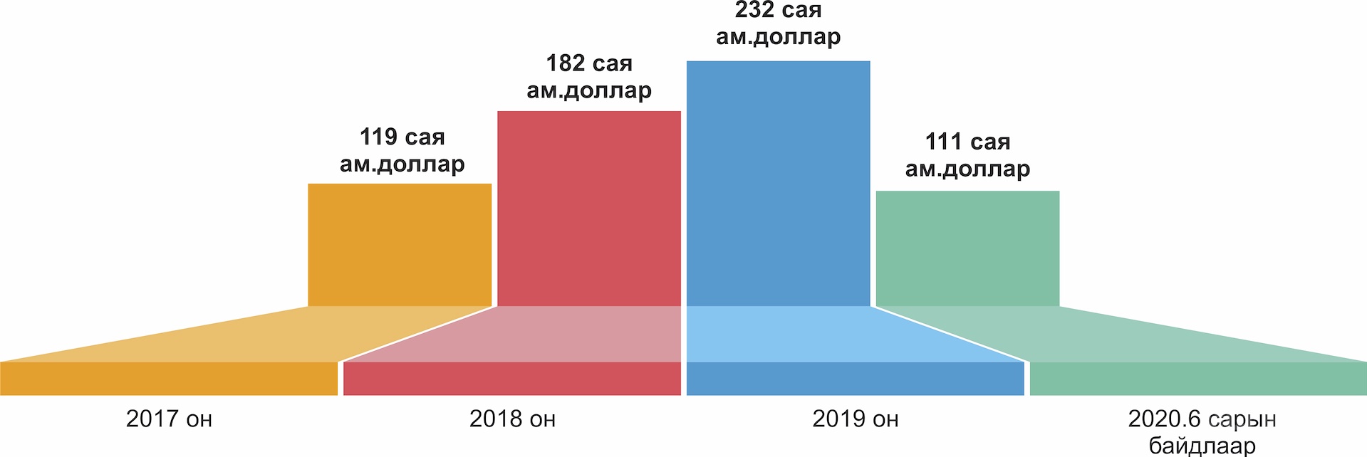 2020 онд 6 сар - 110,587,100 ам.доллар, 2019 онд - 232,169,065, 2018 он - 181,655,670, 2017 он - 119,095,501 /графикаар үзүүлэх/