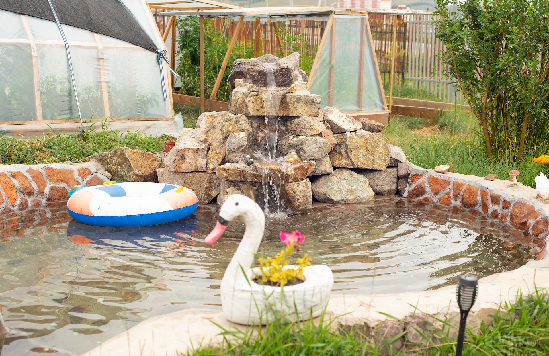 Усан санг байгалийн төрх шинжийг агуулж хийхийг зорьж чулуугаар, хүрхрээтэй хийж, мөн усаар хүлэмжний ногоо, мод бут цэцэг ногоогоо усалдаг.
