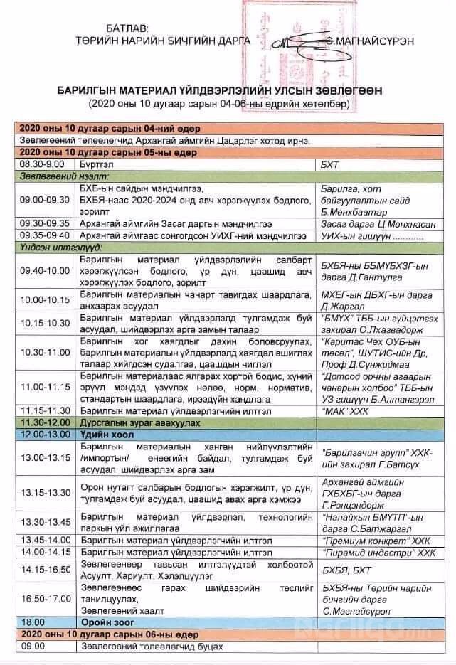 Монгол улсын Засгийн Газрын 2019 оны 70-р тогтоолоор баталсан “Төрөөс барилгын салбарт баримтлах бодлого”-ын 2.2.5 дахь зорилт “Барилгын материал, бүтээгдэхүүн чанар, аюулгүй байдлын хяналтыг сайжруулах”-ыг хэрэгжүүлэх ажлын хүрээнд барилгын материал үйлдвэрлэлийн өнөөгийн нөхцөл байдлыг хэлэлцэж, цаашид авч хэрэгжүүлэх арга хэмжээг тодорхойлох, дотоодын үйлдвэрлэлийг өргөжүүлэн хөгжүүлж, бүтээгдэхүүний чанар стандартыг сайжруулах зорилгоор Барилгын материал үйлдвэрлэлийн улсын зөвлөгөөнийг өнөөдөр \2020.10.05\ АРХАНГАЙ аймгийн төв ЦЭЦЭРЛЭГ хотноо зохион байгуулж байна.