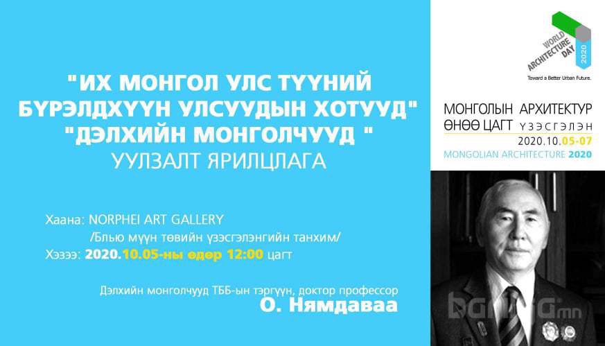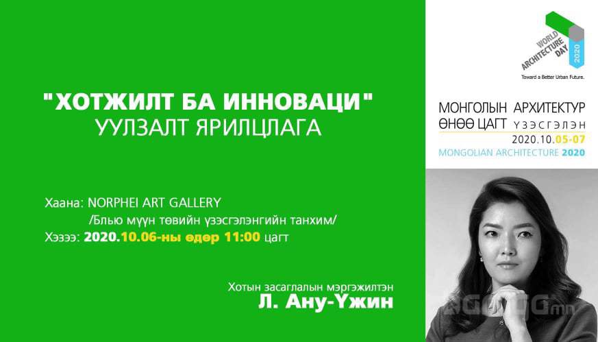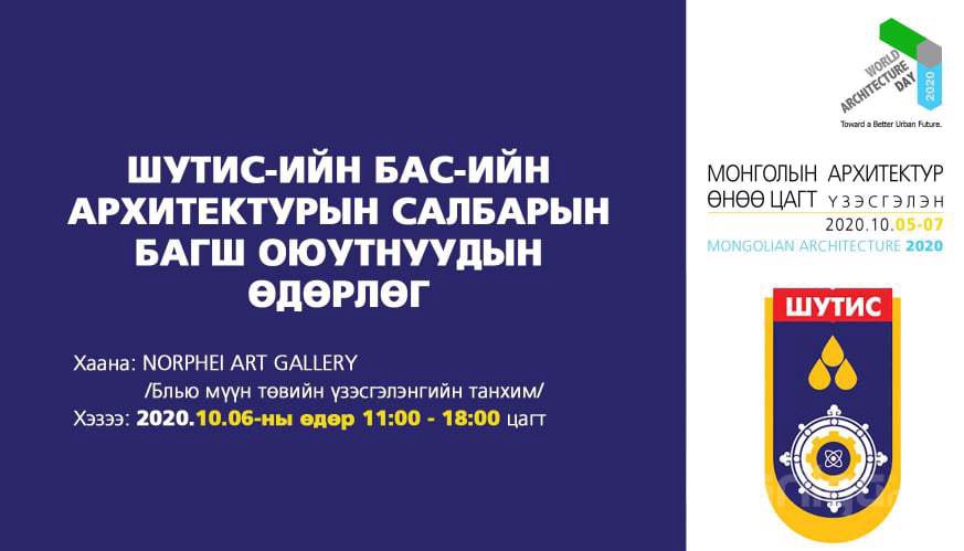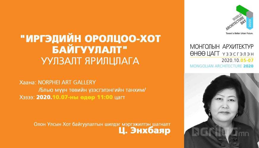 Монголын Хот Байгуулалтын Хөгжлийн Танхим (МХБХТ) нь Дэлхийн архитектурын энэ өдрийг тохиолдуулан Монголын шилдэг архитектор, уран бүтээлчдийн “Монголын Архитектур Өнөө цагт 2020” үзэсгэлэнг Их Монгол Улсын нийслэл Хархорум хот байгуулагдсаны 800 жилийн ойн хүрээнд 10 дугаар сарын 05-07-ны өдрүүдэд “Norphei Art Gallery” үзэсгэлэнгийн танхимд зохион байгуулагдаж байна.