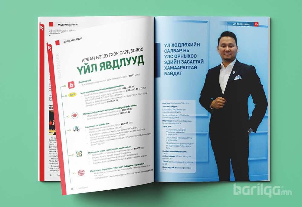 Барилгын салбарынхны сар бүр захиалан хүлээдэг Барилга МН сэтгүүлийн 126 дахь шинэхэн дугаар хэвлэгдэн гарлаа. Салбарын захиалагч, уншигч нартаа зориулан сар бүр салбарын нэр хүнд бүхий VIP зочны ярилцлага, амины орон сууц, салбарын судалгаа, иргэдэд зориулсан хэрэгтэй зөвлөгөө, шинэ материал, технологийн дэвшил, архитектур дизайн, материал болон ажил гүйцэтгэлийн үнэлгээ, шинэ орон сууцны үнэ ханш болоод бусад мэдээ, мэдээллүүдийг тогтмол хүргэдэг билээ.