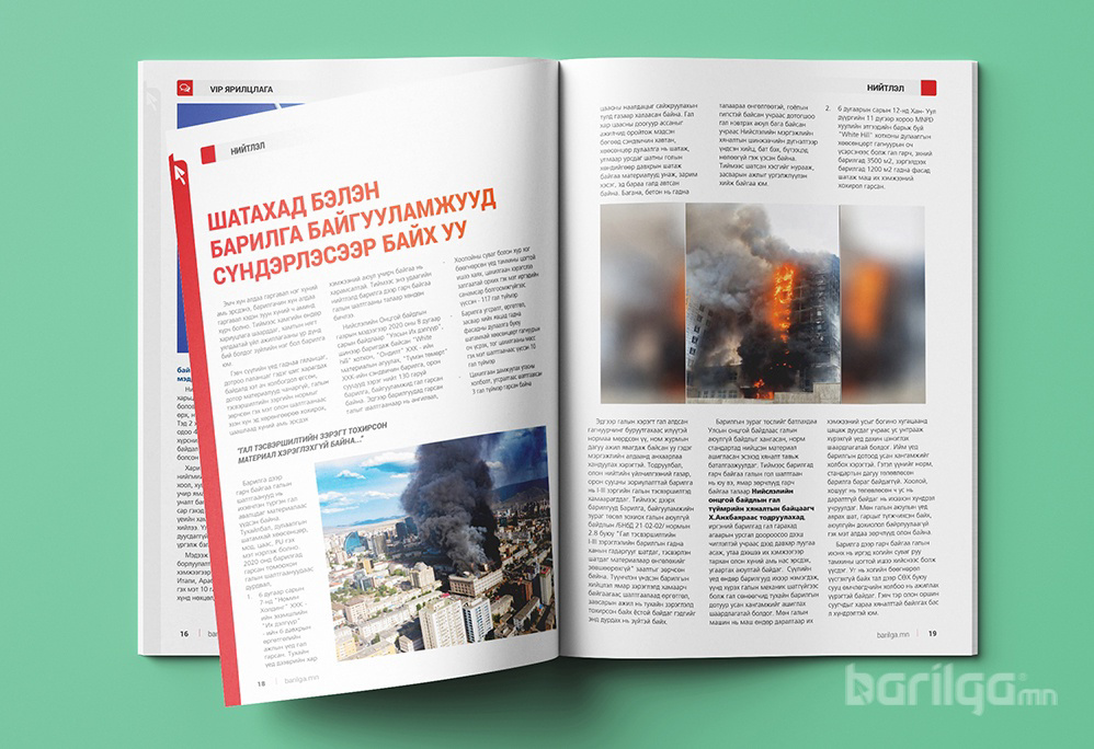 Нийтлэл: Сүүлийн үед гаднаа гяланцаг, дотроо паланцаг гэдэг шиг харагдах байдалд хэт ач холбогдол өгсөн, дотор материалууд чанаргүй, галын тэсвэршилтийн зэргийн нормыг зөрчсөн гэх мэт олон шалтгаанаас эзэн хүн эд хөрөнгөөрөө хохирох, цаашлаад хүний амь эрсдэх хэмжээний аюул учирч байгаа нь харамсалтай. Тиймээс энэ удаагийн нийтлэлд барилга дээр гарч байгаа галын шалтгааны талаар хөндөн бичлээ.