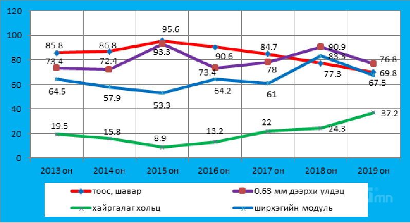Элс нь ширхэглэлийн бүрэлдэхүүн (ширхэгийн модуль, 0,63мм шигшүүр дээрхи нийлбэр үлдэц)-ээр ч шаардлага бүрэн хангахгүй байна. Энэ нь аливаа бүтээгдэхүүний зайлшгүй хэрэглээ, түүнд үүссэн хомсдолоос үүдэн чанаргүй бүтээгдэхүүний нийлүүлэлт нэмэгддэгийг харуулж байна.