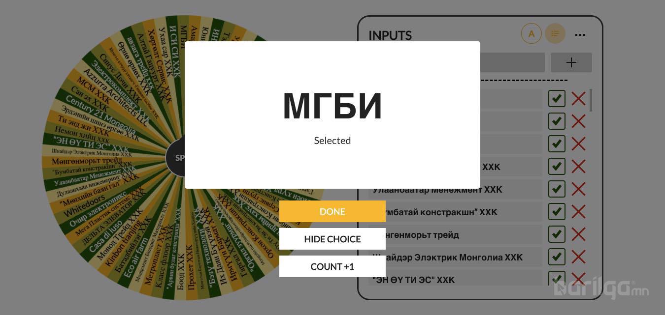 Харин эрхийн эзэн компанийг 2020 оны 12-р сарын 29-ны өдөр https://pickerwheel.com/ сайтаар буюу санамсаргүй байдлаар шалгарууллаа.