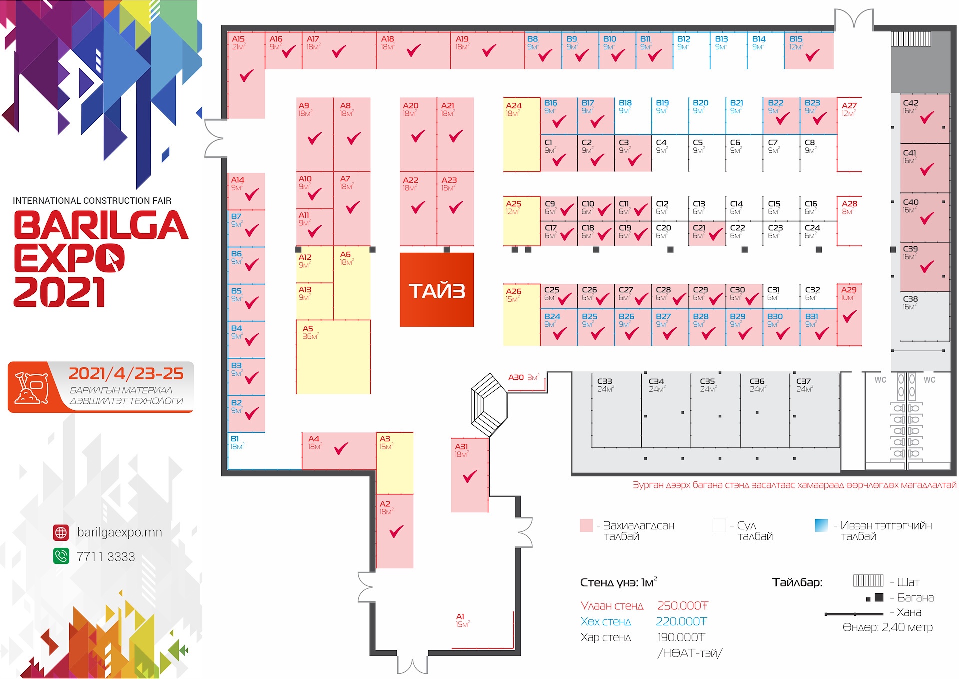 Барилгын салбарт шилдэг бүтээгдэхүүн үйлчилгээ, дэвшилтэт техник, технологи нэвтрүүлэх мөн иргэдийн олон талт эрэлт хэрэгцээг хангах, бизнес эрхлэгчдийн хамтын ажиллагаа, зах зээлийг өргөжүүлэх зорилготой “BARILGA EXPO-2021” Олон улсын барилгын үзэсгэлэн, яармаг: - Барилгын материал, техник технологи чиглэлээр 2021 оны 4-р сарын 23-25-нд,