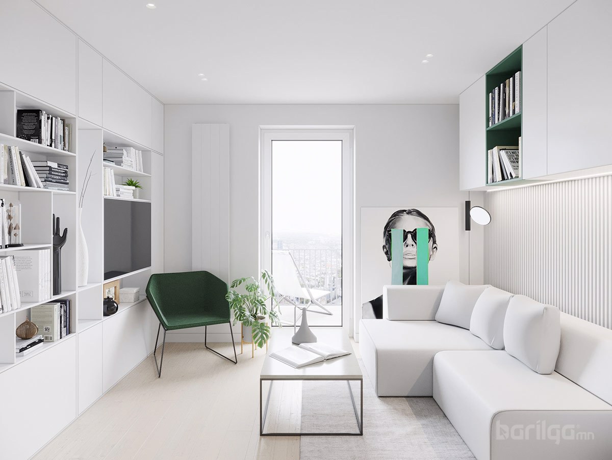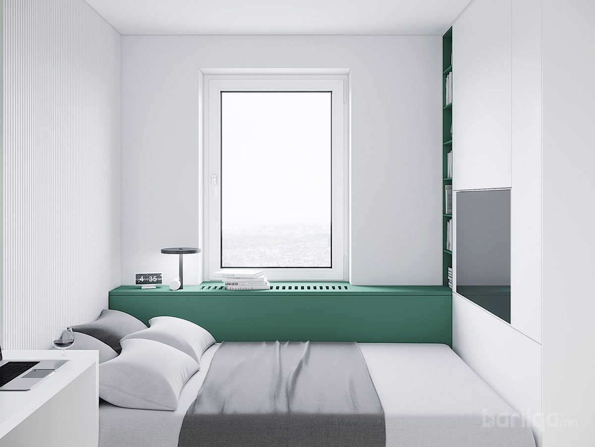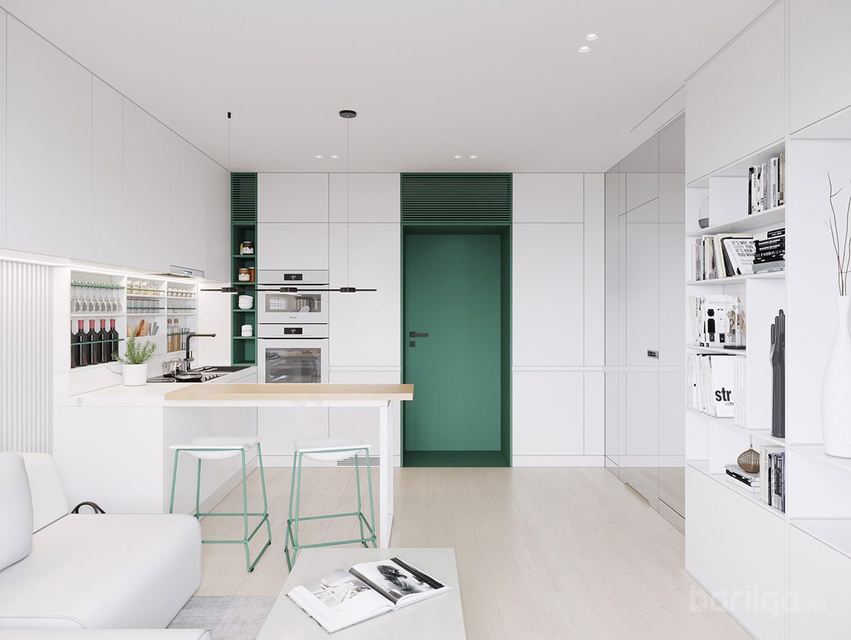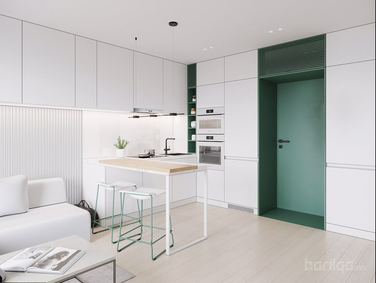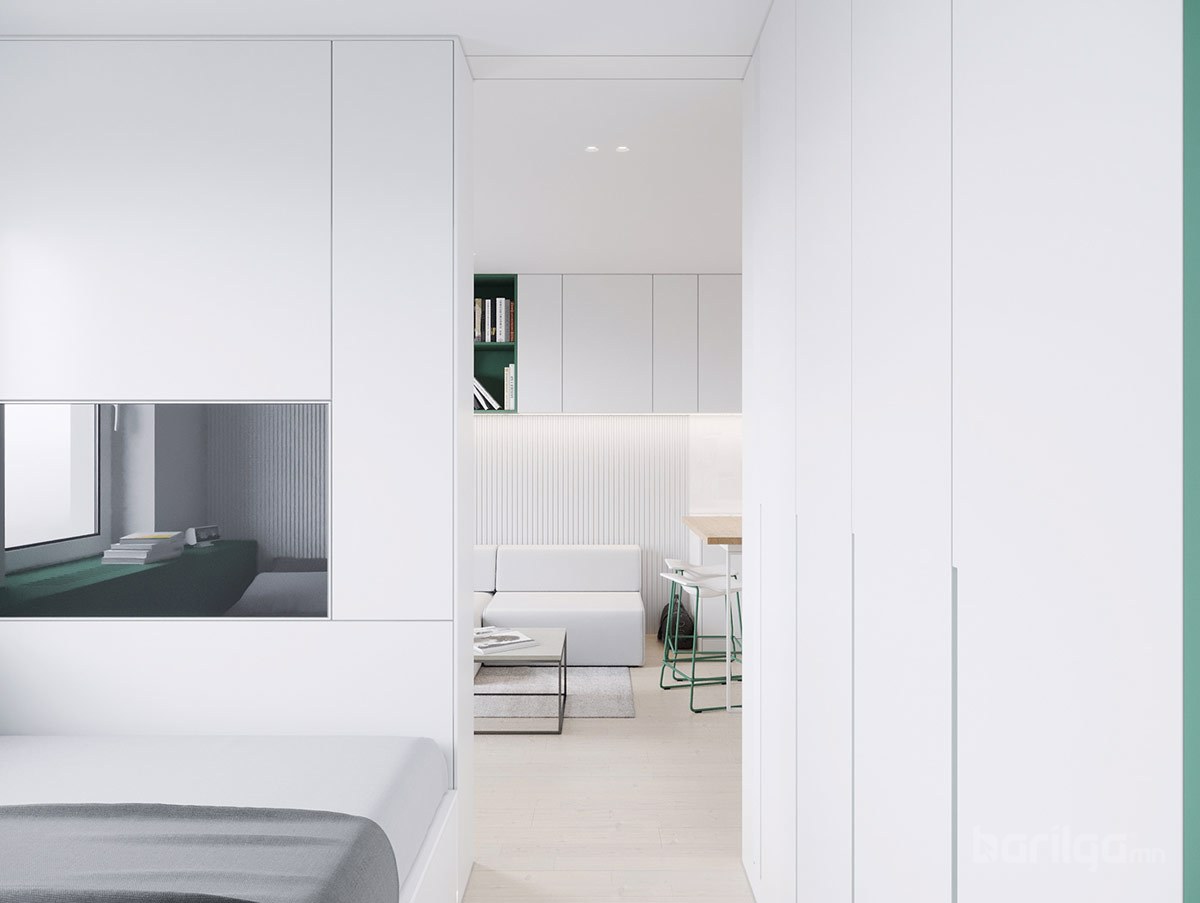 Польшийн Гданьск хотод байрладаг 28 метр квадрат талбайтай энэхүү цэвэрхэн авсаархан байрны цагаан өнгийн шийдлийг ногоон өнгөөр тодруулж өгсөн нь интерьерийн нэгэн онцдог шийдэл болсон байна. Буйдан дээрх ханын шүүгээ нь хөрш гал тогоотой холбогч элемент үүсгэдэг. Энэхүү үл үзэгдэх холболт нь хоёулаа орон зайд хүчтэй байр суурийг эзэлдэг юм.