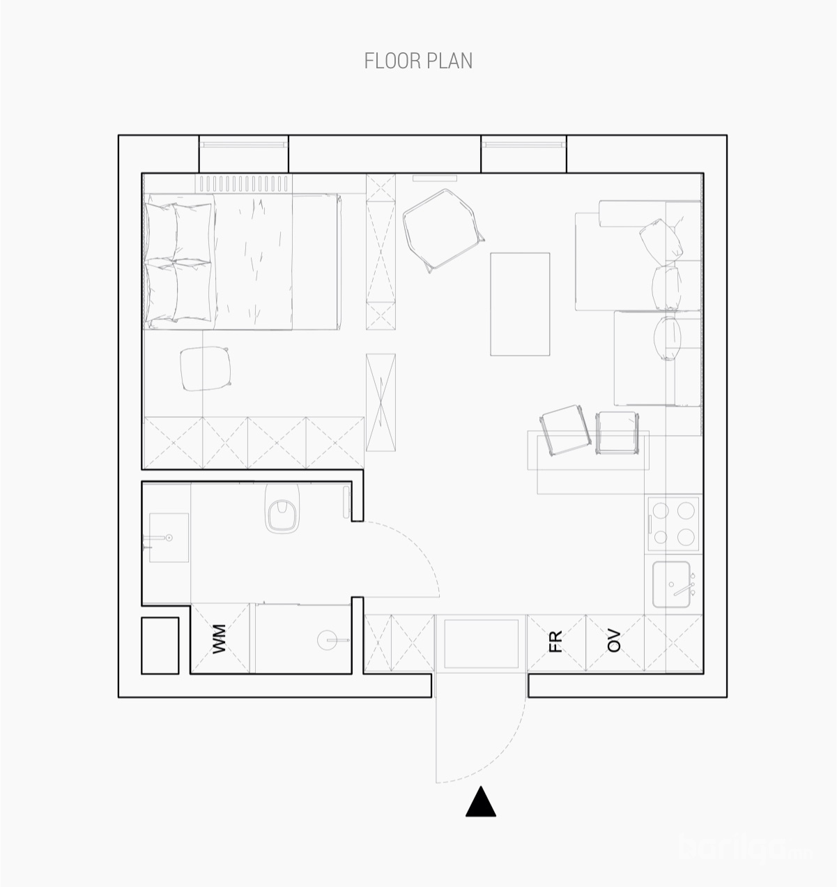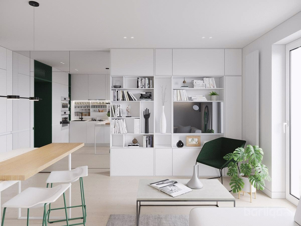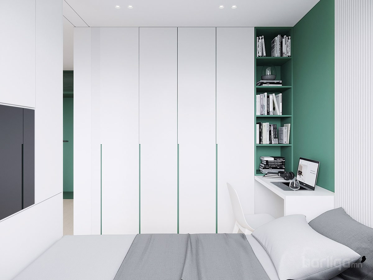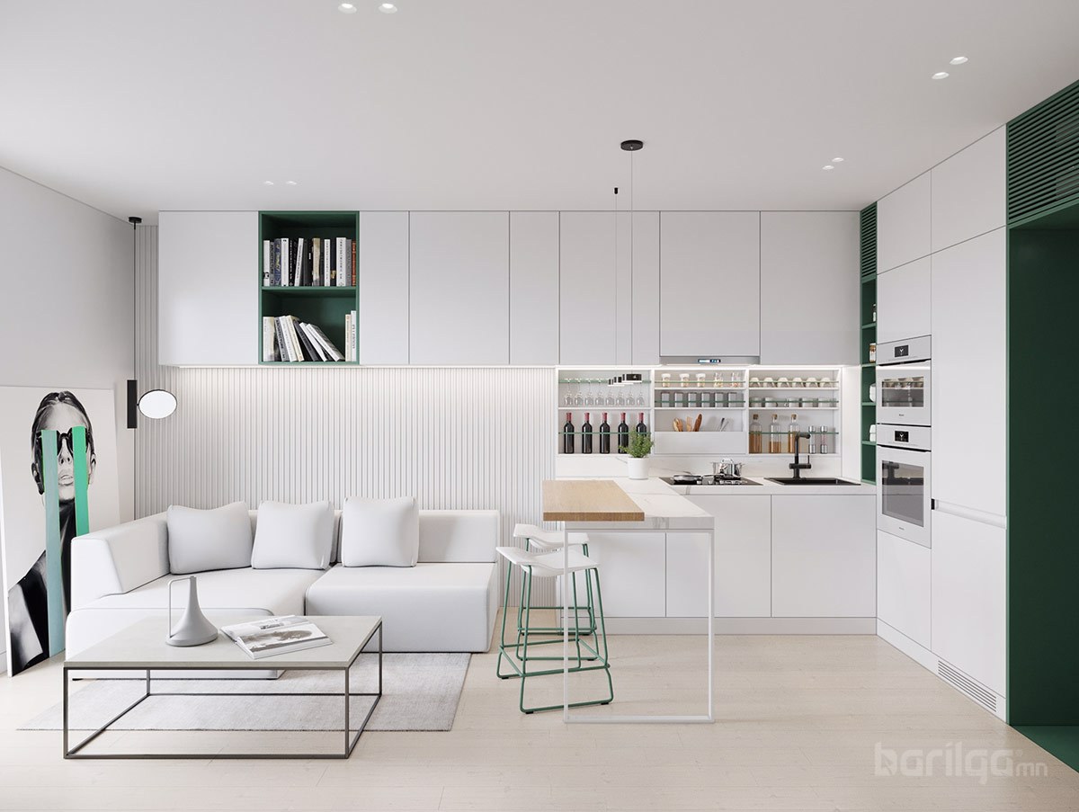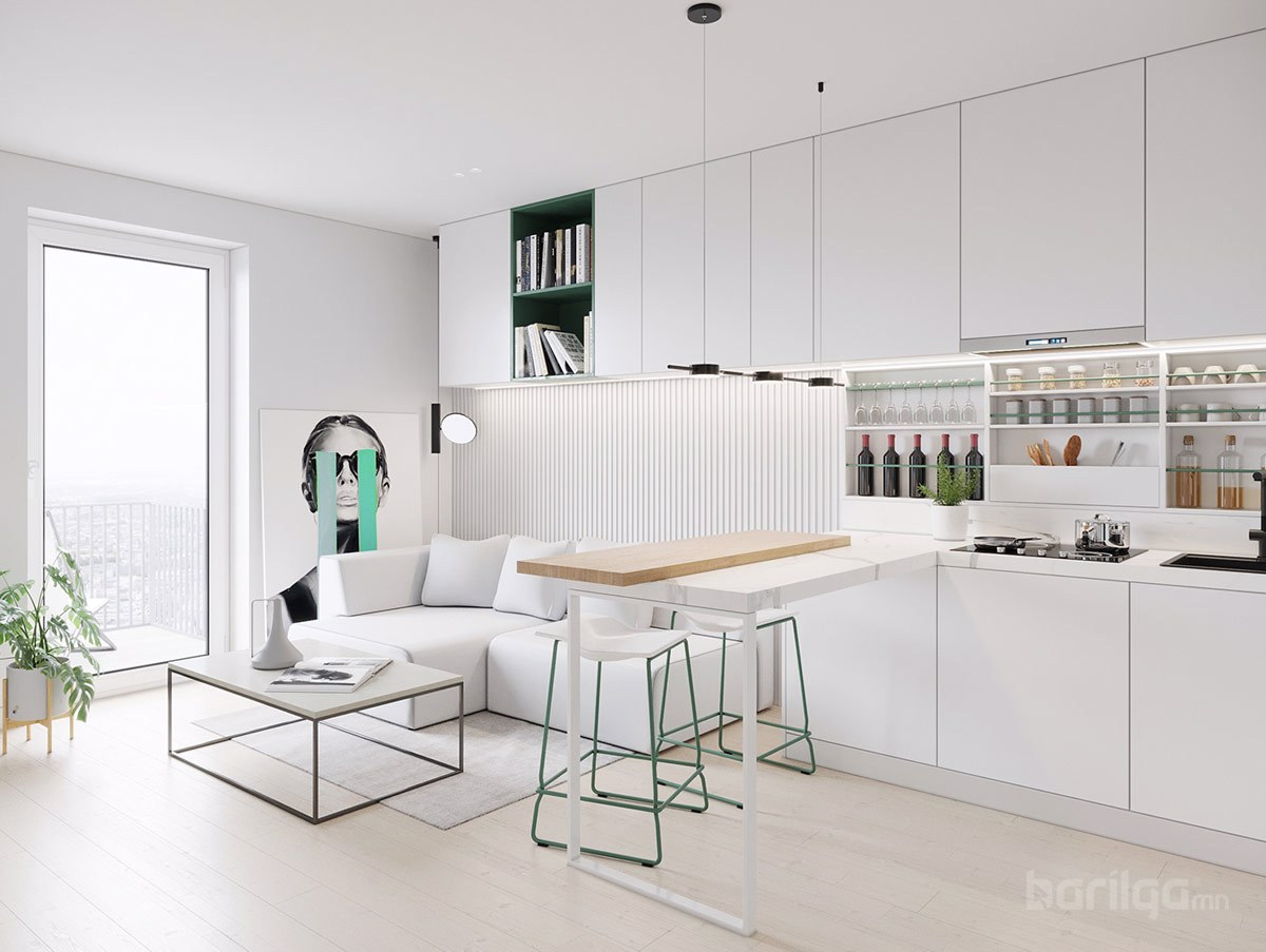 Польшийн Гданьск хотод байрладаг 28 метр квадрат талбайтай энэхүү цэвэрхэн авсаархан байрны цагаан өнгийн шийдлийг ногоон өнгөөр тодруулж өгсөн нь интерьерийн нэгэн онцдог шийдэл болсон байна. Буйдан дээрх ханын шүүгээ нь хөрш гал тогоотой холбогч элемент үүсгэдэг. Энэхүү үл үзэгдэх холболт нь хоёулаа орон зайд хүчтэй байр суурийг эзэлдэг юм.