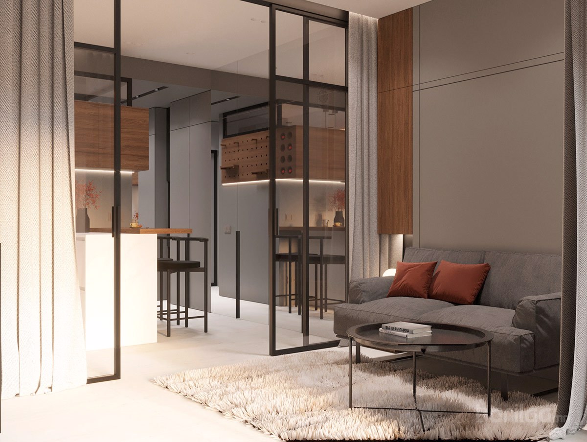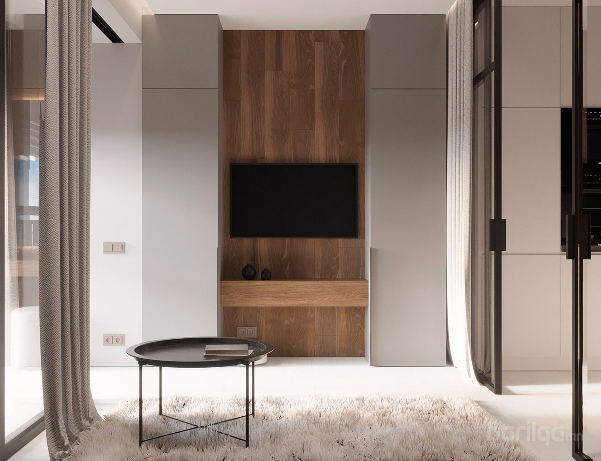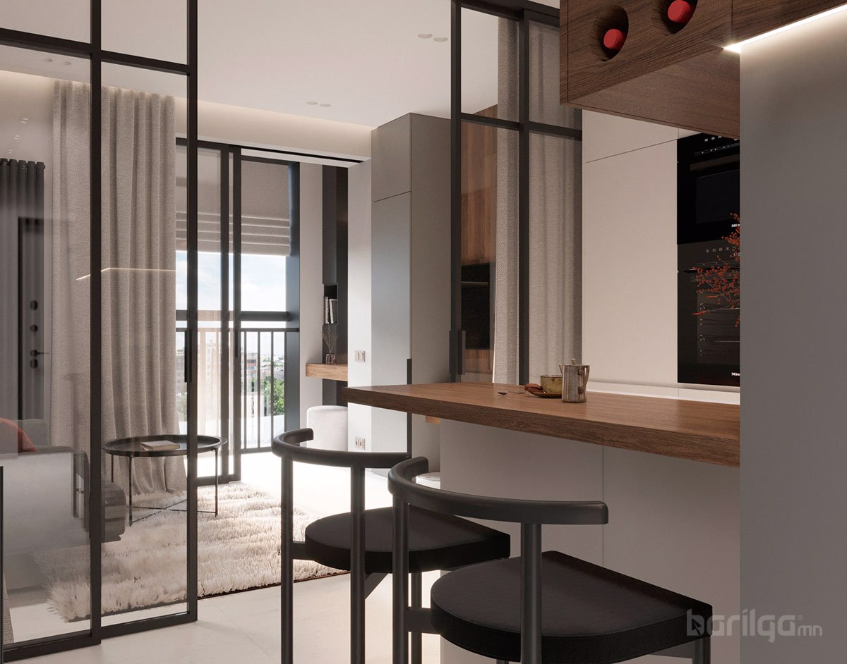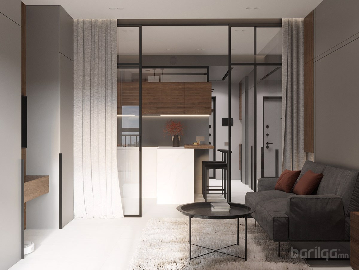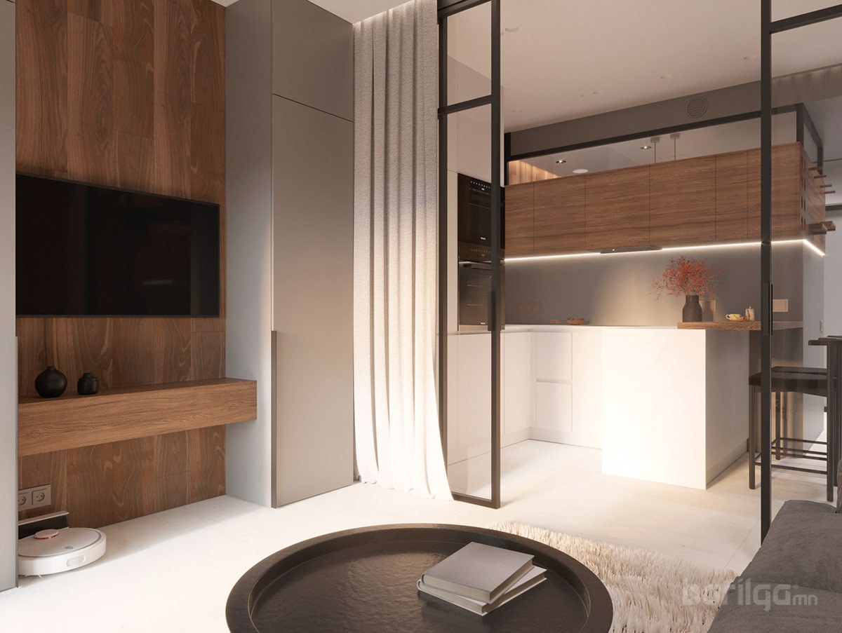 Бидний дараагийн аялал ОХУ-ын Москва хотод байрладаг оро сууцанд явагдана. Энэхүү 30 метр квадрат интерьер дотор хүрэн, саарал өнгөний зөөлөн тавилгаас үүдэн тайван дулаахан уур амьсгал ургадаг. Шилэн хана нь зочны өрөөний хоёр талыг дайрч, төвд нь буйдан байрлуулсаар зочны өрөөг гал тогооны өрөөнөөс тусгаарлаж буланд нь суудлын буйдан тавьж өгснөөр маш бага зайнд амралтын хэсгийг шийдэж өгсөн байна.