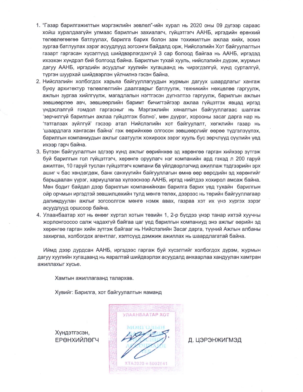 Түүнчлэн Нийслэлийн холбогдох харьяа байгууллагуудын журмын дагуух шаардлагыг хангаж /архитектур төлөвлөлтийн даалгаврыг батлуулж, техникийн нөхцөлөө гаргуулж, ажлын зургаа хийлгүүлж, магадлалын нэгтгэсэн дүгнэлтээ гаргуулж, барилгын ажлын зөвшөөрлөө авсан/ зөвшөөрлийн баримт бичигтэйгээр ажлаа гүйцэтгэх явцад иргэн үндэслэлгүй гомдол гаргасныг нь мэргэжлийн хяналтын байгууллага, дүүрэг, хорооны засаг дарга нар шалгаж “ЗӨРЧИЛГҮЙ” гэдгийг баталсан ч Нийслэлийн хот байгуулалт, хөгжлийн газар нь өөрийнхөө олгосон зөвшөөрлийг өөрөө түдгэлзүүлж, барилгын компаниудын ажлыг саатуулж хохироох зэрэг хууль бус зөрчлүүд сүүлийн үед ихээр гарч байна.