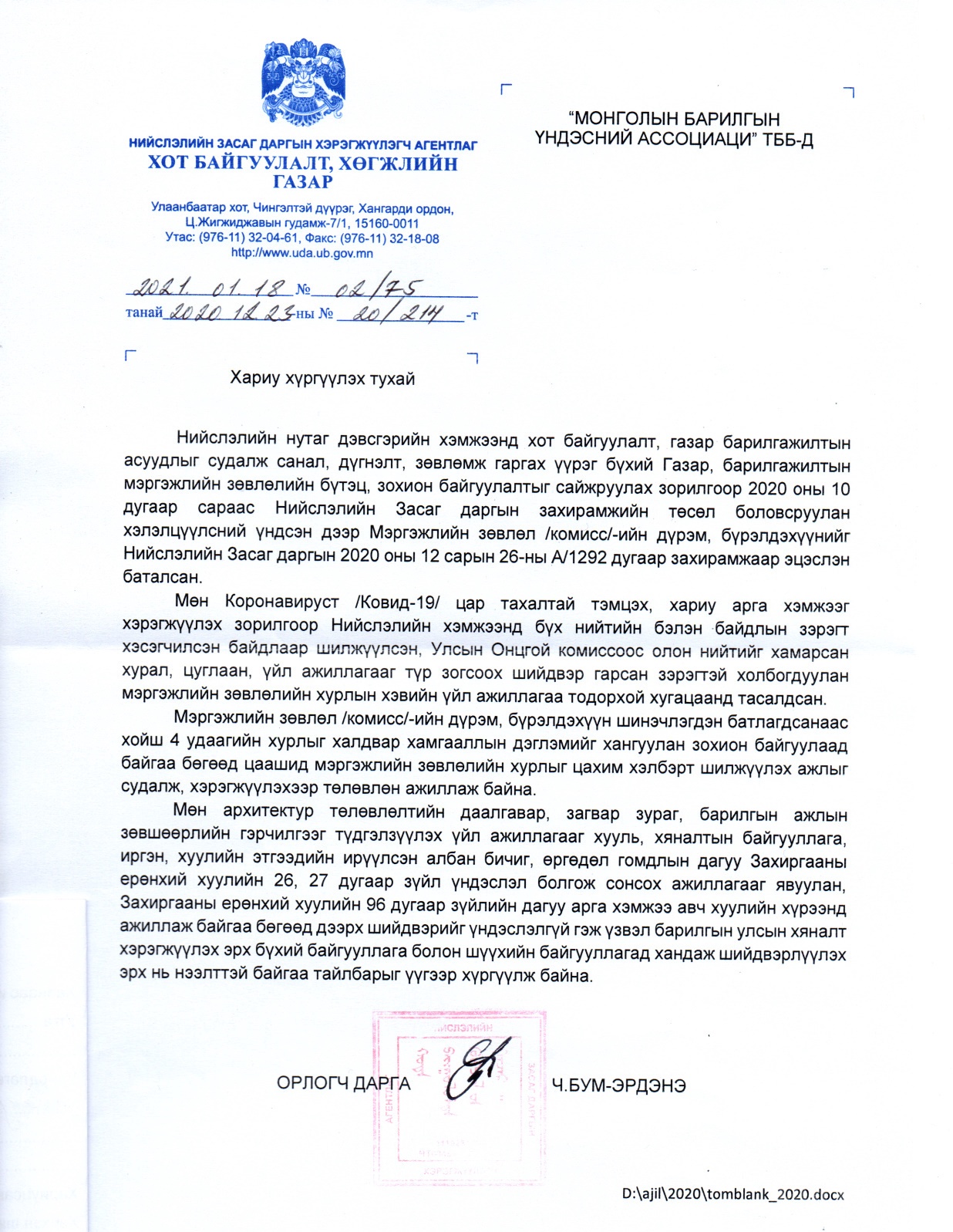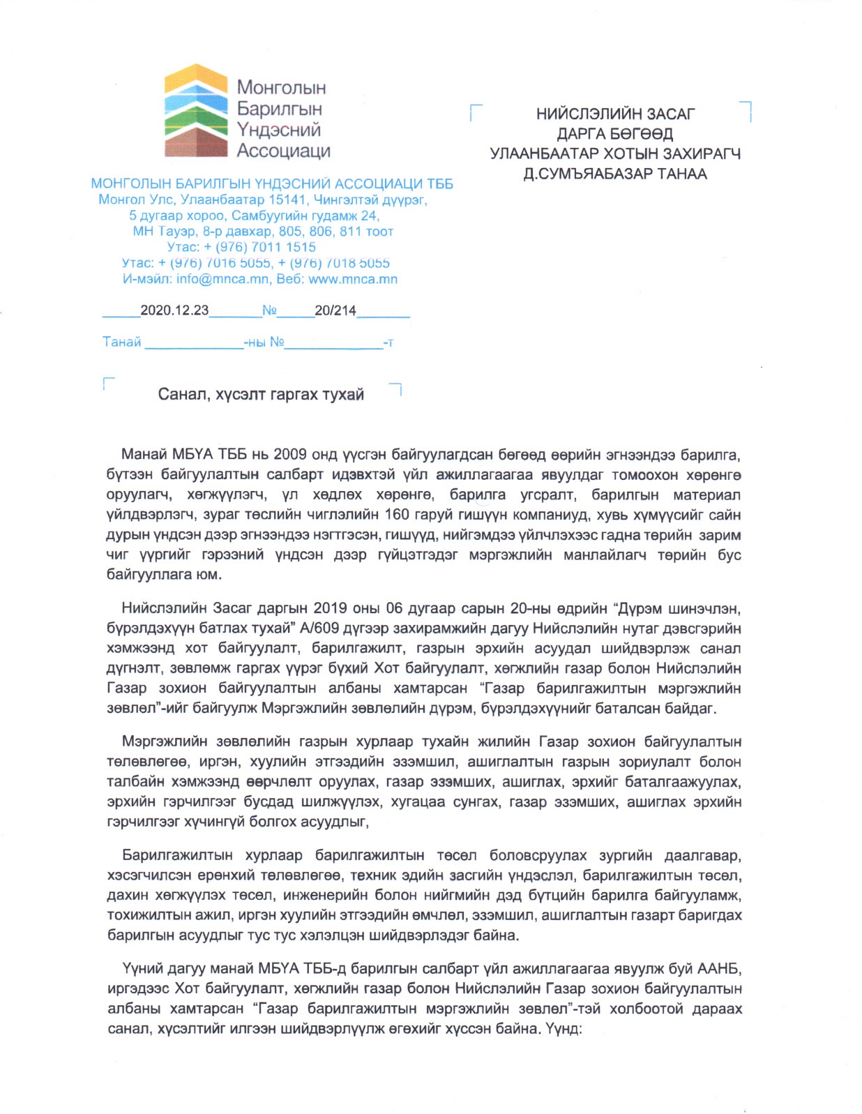 Энэ талаар Хот байгуулалт, хөгжлийн газар болон Нийслэлийн Газар зохион байгуулалтын албаны хамтарсан “Газар барилгажилтын мэргэжлийн зөвлөл” - д МБҮА - аас албан бичгийг хүргүүлээд байна.