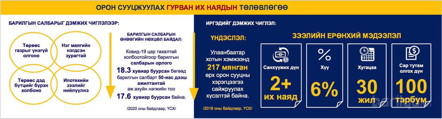 Засгийн газраас иргэдийг орон сууцжуулах бодлогын хүрээнд дэд бүтцийн бүтээн байгуулалт, газар олголт, ипотекийн хөнгөлөлттэй зээлийн нийлүүлэлтийг хийх, нэг маягийн зураг төслөөр хангах зэрэг дэмжлэг үзүүлж 3 их наяд төгрөгийн эх үүсвэр, санхүүжилтийг бүрдүүлэхээр төлөвлөсөн.
