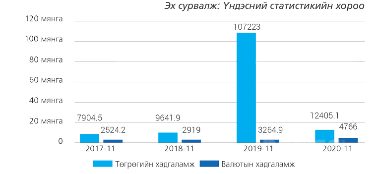 Эдгээр шалтгаанаас хамааран Монгол төгрөгийн ханшны уналт болон Америк долларын ханшны өсөлт болно гэсэн хүлээлт иргэдийн дунд үүсэж, санхүүгийн эрсдэлд орохоос сэргийлэн мөнгөө валютын хадгаламжинд оруулан зарим хэсгийг ҮХХ болгосон. 2020 оны 10 дугаар сарын байдлаар өнгөрсөн оны мөн үетэй харьцуулахад валютын хадгаламж 53 гаруй хувиар нэмэгдсэн үзүүлэлттэй байгаа юм.
