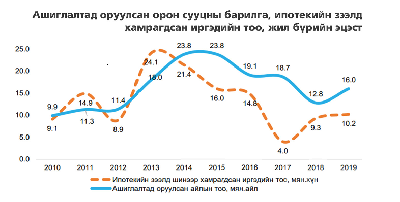 Харин 2021 оны орон сууцны үнийг ярихын тулд үнэд нөлөөлөгч хүчин зүйлсийг авч үзэх хэрэгтэй. Үүний нэг нь орон сууцны ипотекийн зээл буюу эрэлт талыг хэрхэн дэмжих вэ? гэсэн асуулт юм. 2019 онд 16.0 мянган айл бүхий орон сууцны зориулалттай барилга ашиглалтад оруулсан нь 10 жилийн өмнөх буюу 2010 оноос 6.1 мянган айлаар, өмнөх оноос 3.2 мянган айлаар өссөн хэдий ч 2014 оноос 7.8 мянган айлаар буурсан байна. Мөн шинээр 10.2 мянган иргэн ипотекийн зээлд шинээр хамрагдсан байна.