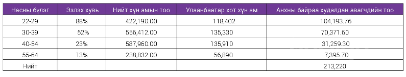 Улсдаа анхны орон байр худалдан авагчдыг насны бүлгээр хувьчлан гаргасан статистик бий. Улаанбаатар хотын хүн амын 230,000 гаруй нь анхны байр худалдан авагч гэж тооцоолвол ҮХХ-н эрэлт бол хангалттай байна.