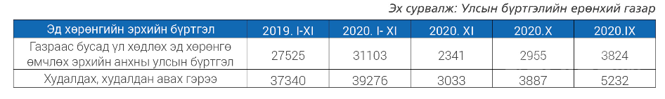 Харин Улсын бүртгэлийн газрын тоо баримтаас үзвэл үл хөдлөх хөрөнгийн салбарт сар бүр 3000 - 3800 орчим үл хөдлөх хөрөнгө худалдах, худалдан авах гэрээгээр шилжиж байна. Энэ нь ҮХХ- ийн нийт зах зээлийн 20 гаруй хувийг тусгай зөвшөөрөлтэй байгууллагууд, 80 орчим хувийг хувь хүмүүсийн хооронд явагдаж байгаатай холбон тайлбарлаж болох юм.