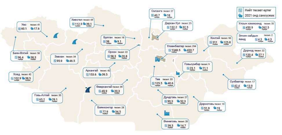 Монгол Улсын төсвийн хөрөнгө оруулалтаар 2021 онд санхүүжүүлэх төсөл, арга хэмжээг байршлаар харуулбал: