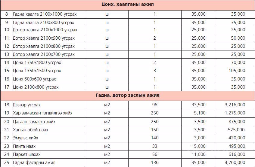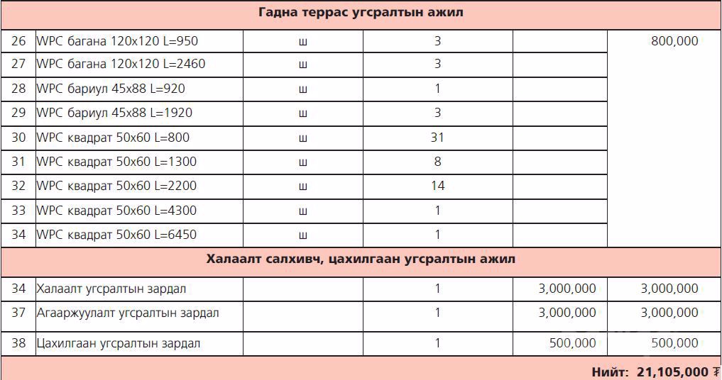 Тусгай ажил: Халаалт, салхивч, цэвэр, бохир ус, дотор гэрэлтүүлэг, гадна шугам сүлжээ, гадна засал, дотор засал, бусад ажлууд /довжоо, пандус, хаяавч, бусад / гэх мэт;