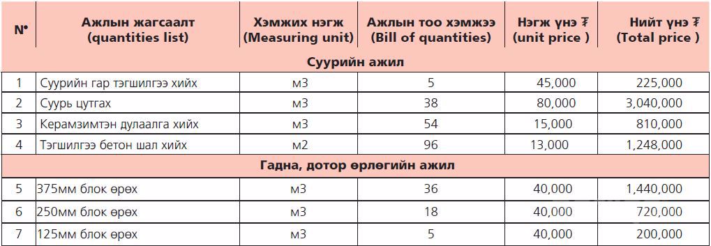 Барилгын ажил: Газар шорооны ажил,суурийн ажил, хана, хамар хана, хучилт, дээвэр, хаалга, цонх, шат, шал