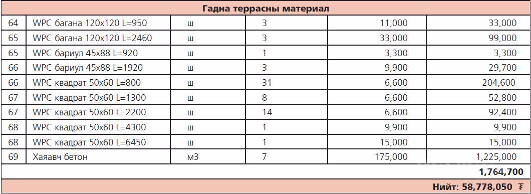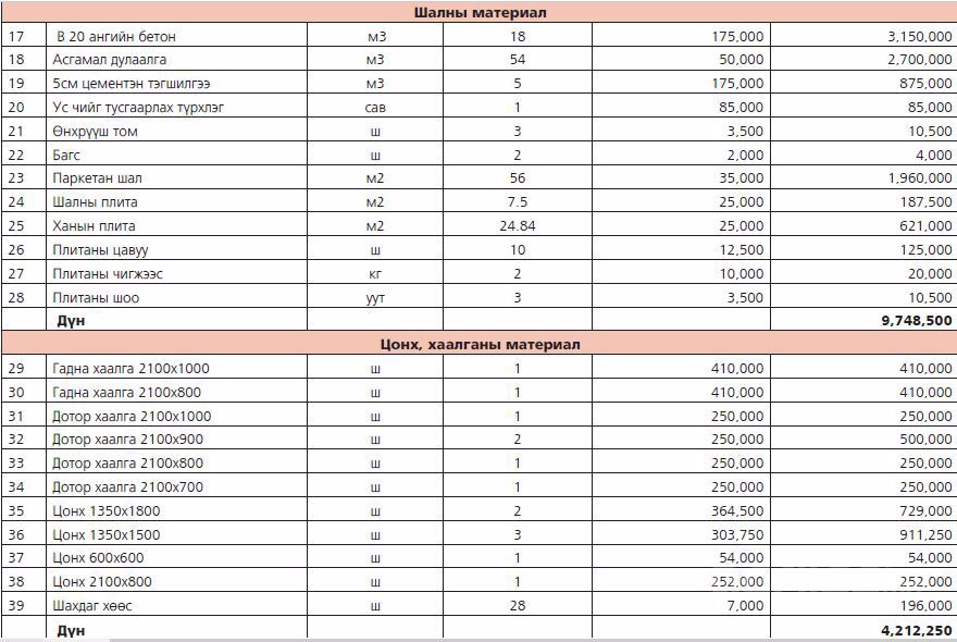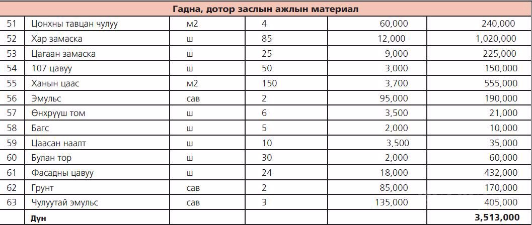 Ажлын тоо хэмжээгээр материалын нийт орцыг тодорхойлж, нэр төрлөөр нь нэгтгэнэ.