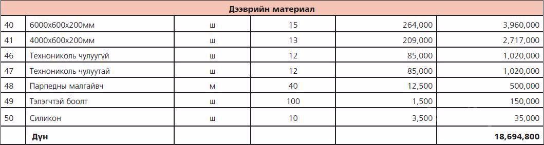 Ажил тус бүрд орох материалын жагсаалт гаргана.