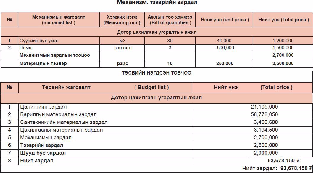 Материал, хийц эдлэлийн хэрэгцээ, үнийн тооцоо;
