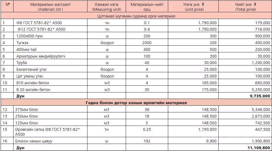 Хана: Гадна ба дотор даацын болон даацын бус ханыг D400-D700 маркаас доошгүй хийт бетон блокоор өрж, зориулалтын цавуугаар нааж өрнө.