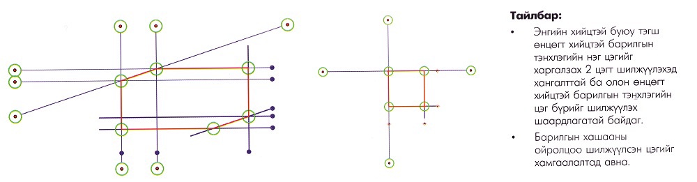 -Тэг тэнхлэгийг алдаагүй шилжүүлэх -Тэг тэнхлэгийг барилга угсралтын ажлын үед геодезийн тэмдэгтүүдийн байрлалыг өөрчлөгдөхгүй байх нөхцөлийг хангах |