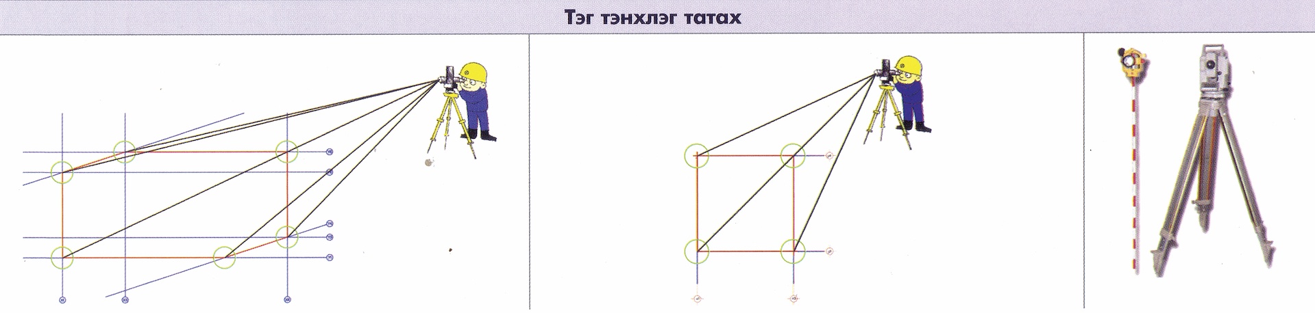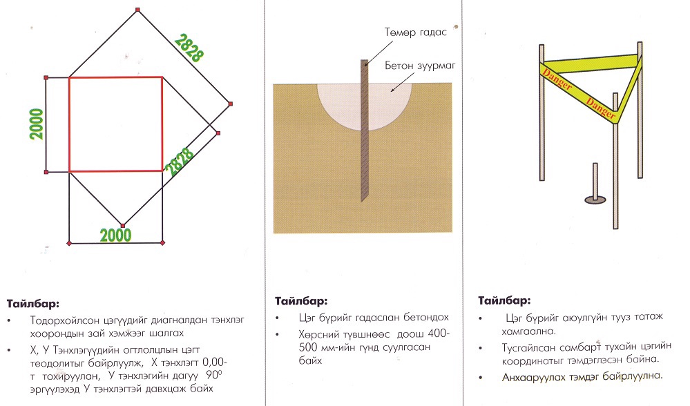 -Барилга байгууламжийн тэг тэнхлэгийг зураг төсөлд заасны дагуу геодезийн тэмдэглэгээ /улаан шугам/-тэй уялдуулан тухайн барилгын ажлын талбайд барилгын геодези, зураг зүйн ажил эрхлэх эрх бүхий хуулийн этгээд тогтооно. /Барилгын тухай хуулийн 16.2-р заалт/ -Цэг бүрийг тодорхойлох |
