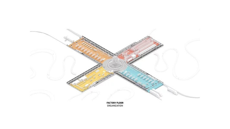 Энэхүү барилга нь төв хэсэгт холбодог агуулах, өнгөт үйлдвэр, модны үйлдвэр, угсралт гэсэн дөрвөн үндсэн үйлдвэрлэлийн танхимаас бүрдсэн радиаль массив хэлбэрээр баригдсан юм. Зохион байгуулалт нь үйлдвэрлэлийн хэсгүүдийн хоорондох үр ашигтай, уян хатан, ил тод ажлын урсгалыг хангаж, уулзвар дээр нь “нэмэх” хэлбэрийг бий болгодог. The Plus-ийн төвд үйлдвэрлэлийн бүх дөрвөн танхимтай шууд холбогддог төлөвлөлтийн алба, үзэсгэлэнгийн төв байрладаг бөгөөд Vestre-ийн ажилчдад ажлын төлөвлөлтийг хамгийн их үр ашигтайгаар боловсруулах боломжийг олгодог.
