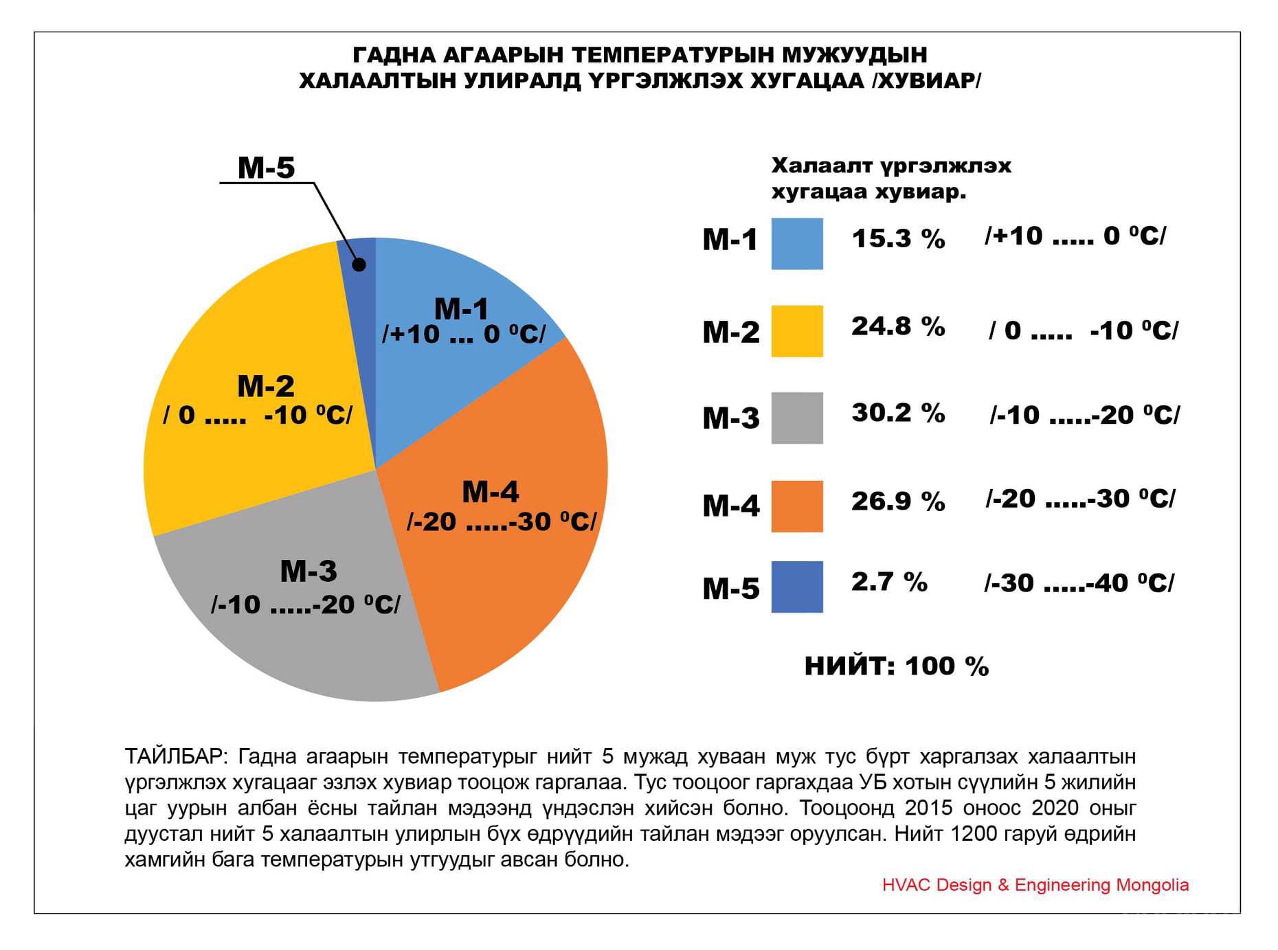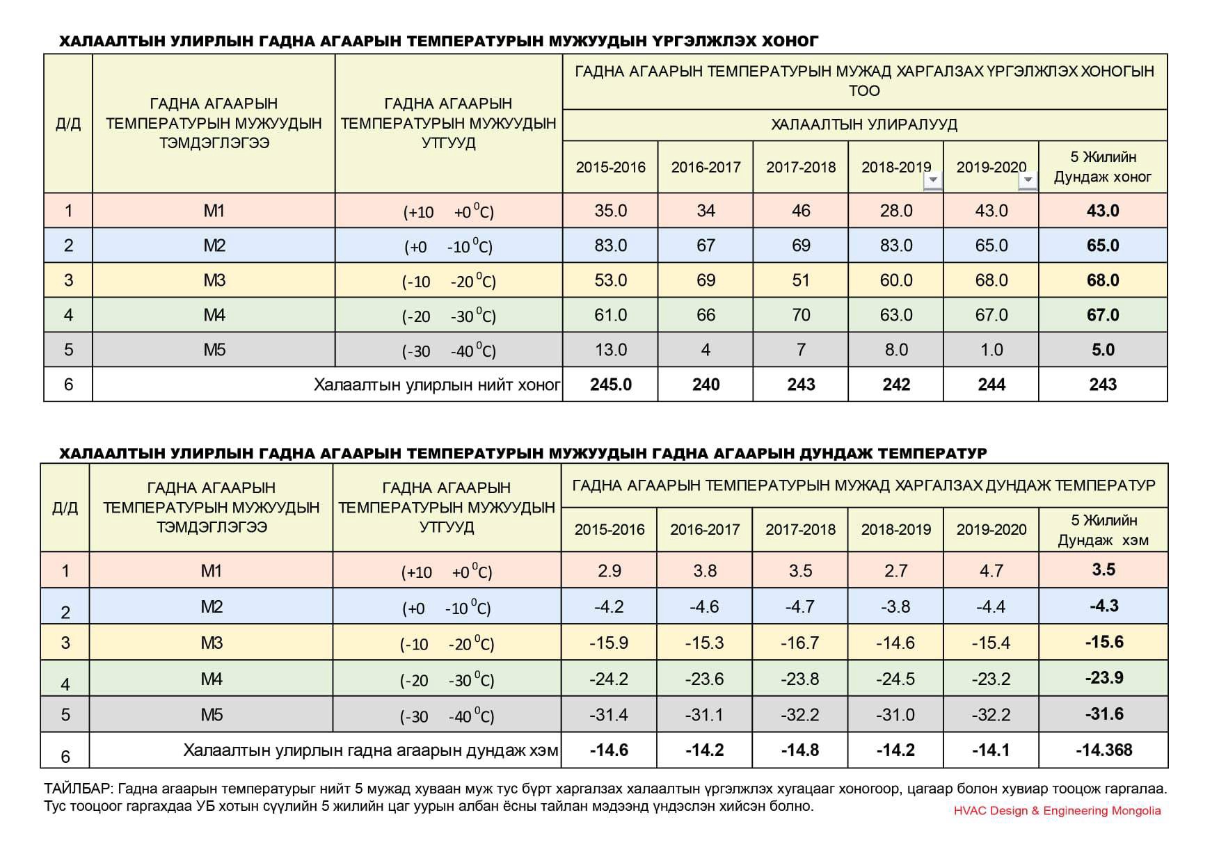 Гадна агаарын температурын мужууд халаалтын улиралд хэд хоног үргэлжлэх, хэдэн цаг явагдах, дундаж температур хэд байх, халаалтын улирлын хугацаанд аль аль температурын муж хэдий хэмжээний хувийг эзэлдэг тухай дэлгэрэнгүй мэдээллийг харж болно. Мужуудыг М1, М2, М3, М4, М5 хэмээн тэмдэглэн үзүүлж хоорондох гадна агаарын температурын зөрүү 10 хэм байхаар хуваалтуудыг хийсэн болно. Ер нь манай улсын хувьд халаалтын улирлын температурын утгыг таван мужид хуваан авч тооцоо судалгааг хийх нь оновчтой санагдлаа.