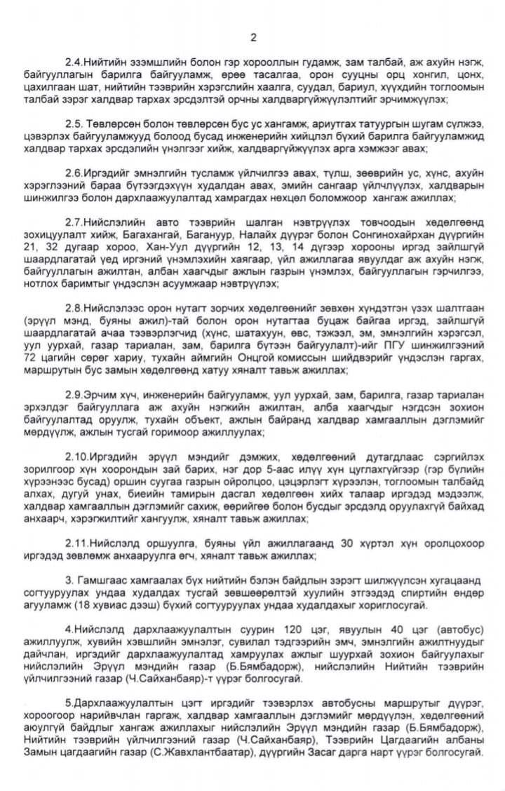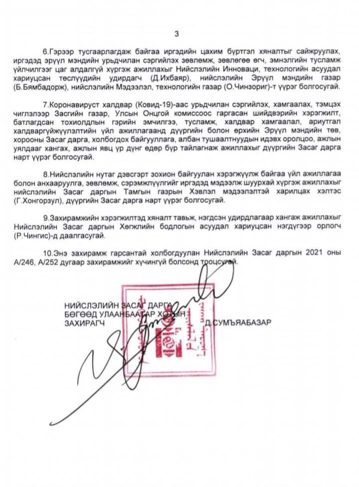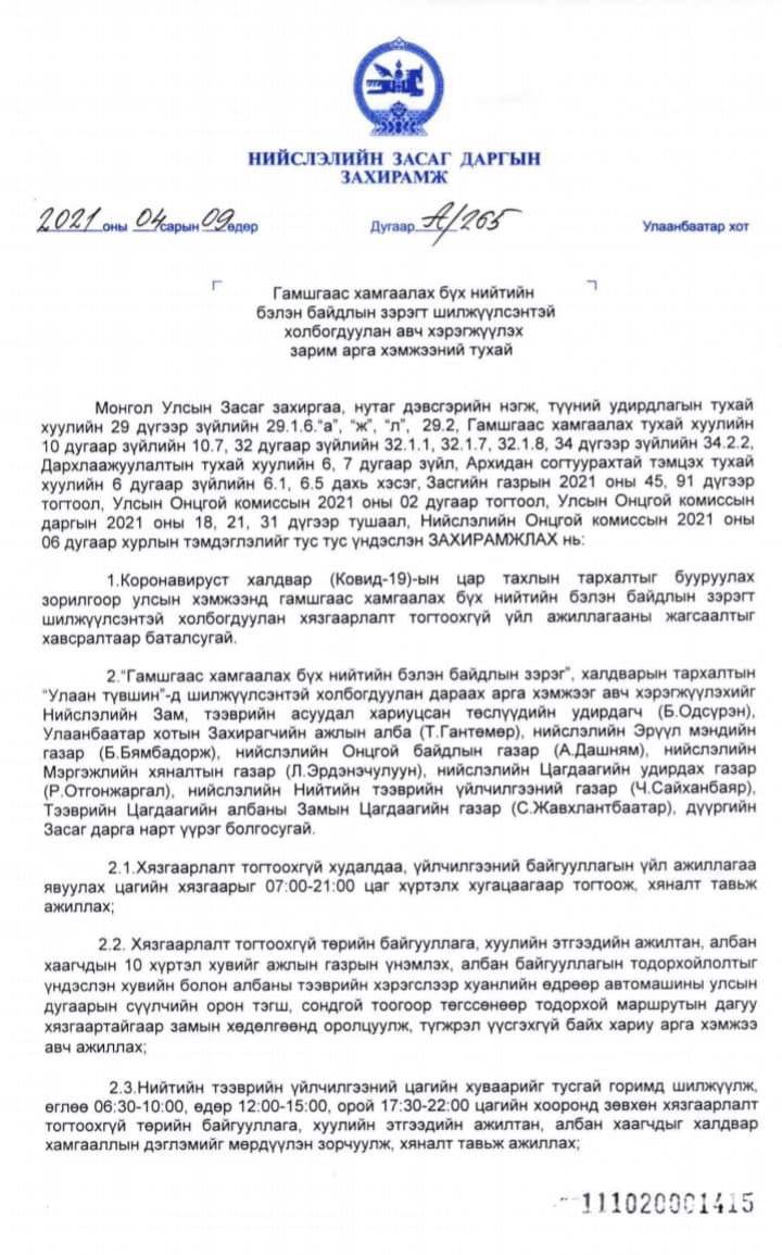 Нийслэлийн Засаг даргын А/265 тоот буюу ”ГАМШГААС ХАМГААЛАХ БҮХ НИЙТИЙН БЭЛЭН БАЙДЛЫН ЗЭРЭГТ ШИЛЖҮҮЛСЭНТЭЙ ХОЛБОГДУУЛАН АВЧ ХЭРЭГЖҮҮЛЭХ ЗАРИМ АРГА ХЭМЖЭЭНИЙ ТУХАЙ” захирамж гарсан. Захирамжаар дөрөвдүгээр сарын 10-ны 06:00 цагаас дөрөвдүгээр сарын 25-ны 00:00 цаг хүртэл бүх нийтийн бэлэн байдлын зэрэгт хэсэгчилсэн байдлаар шилжүүлэхээр болсон билээ.